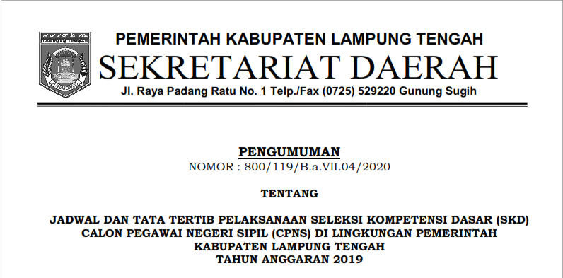 JADWAL DAN TATA TERTIB PELAKSANAAN SELEKSI KOMPETENSI DASAR (SKD) CALON PEGAWAI NEGERI SIPIL (CPNS) DI LINGKUNGAN PEMERINTAH KABUPATEN LAMPUNG TENGAH TAHUN ANGGARAN 2019