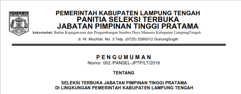 PENGUMUMAN TENTANG SELEKSI TERBUKA JABATAN PIMPINAN TINGGI PRATAMA DI LINGKUNGAN PEMERINTAH KABUPATEN LAMPUNG TENGAH