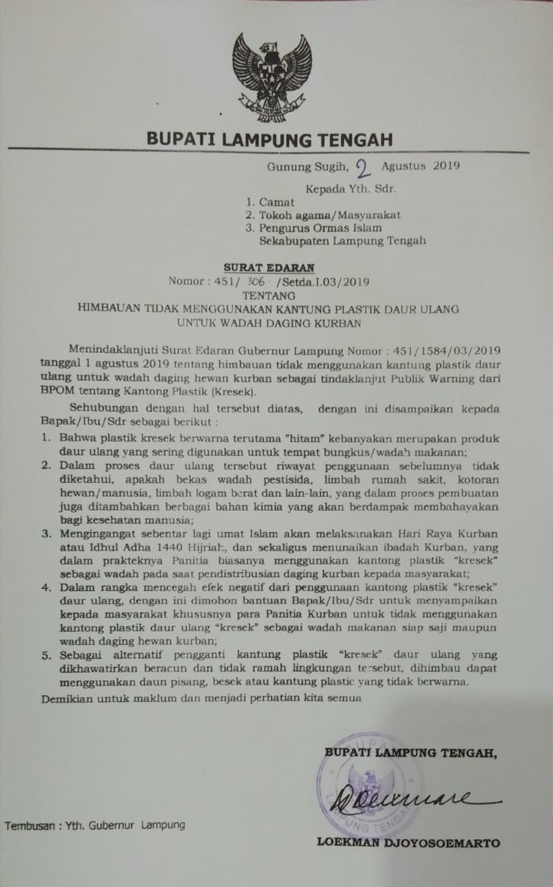 SURAT EDARAN : HIMBAUAN UNTUK TIDAK MENGGUNAKAN KANTUNG PLASTIK DAUR ULANG UNTUK WADAH DAGING KURBAN