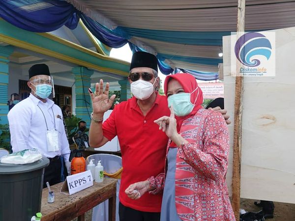 Bupati Lampung Tengah Loekman Djoyosoemarto Bersama Ketua TP PKK Kab. Lampung Tengah Gunakan Hak Suara di TPS 001