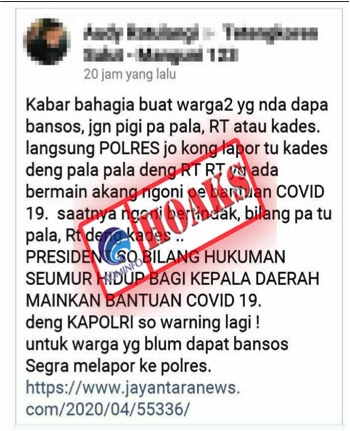 [HOAKS] Jokowi: “Hukuman Seumur Hidup Bagi Kepala Daerah Mainkan Bantuan Covid-19â€