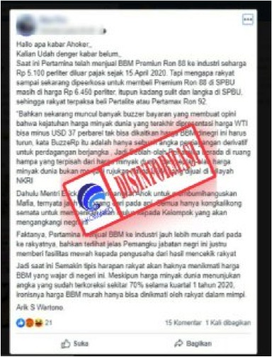 [DISINFORMASI] Pertamina Jual BBM Premium ke Industri Lebih Murah Dibandingkan ke Masyarakat