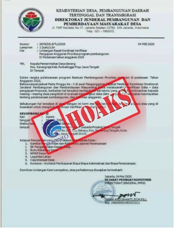 [HOAKS] Surat Undangan Koordinasi Verifikasi Pengajuan Anggaran Prioritas Program Pembangunan di Pedesaan Tahun Anggaran 2020