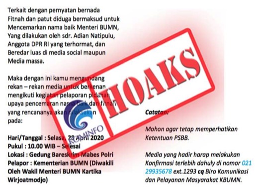 [HOAKS] Kementerian BUMN Akan Melaporkan Seorang Politisi Atas Pencemaran Nama Baik Menteri BUMN Erick Thohir