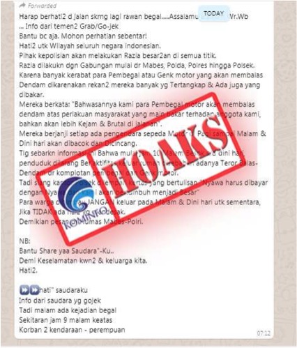 [HOAKS] Pesan Berantai Aksi Balas Dendam Para Pembegal dan Geng Motor