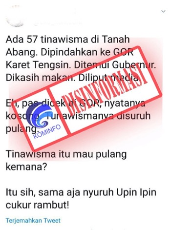 [DISINFORMASI] Sebanyak 57 Tunawisma di Tanah Abang Dipindahkan Ke GOR Karet Tengsin untuk Diliput Lalu Diminta Pulang