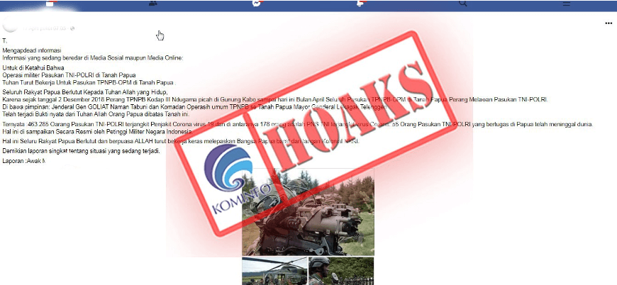 [HOAKS] 463.285 Pasukan TNI dan Polri di Papua Positif Covid 19 dan Banyak Yang Meninggal Dunia