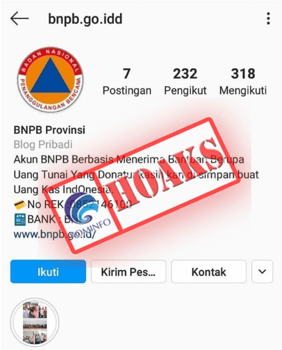 [HOAKS] Akun Instagram Mengatasnamakan BNPB Meminta Sumbangan Dana