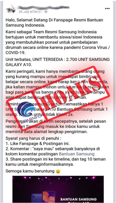 [HOAKS] Fanpage Facebook Samsung Indonesia Adakan Program Bantuan Pendidikan