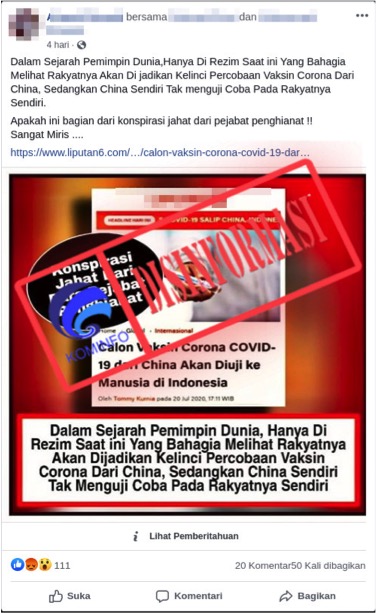 [DISINFORMASI] Indonesia Jadi Kelinci Percobaan Vaksin Covid-19 dari China
