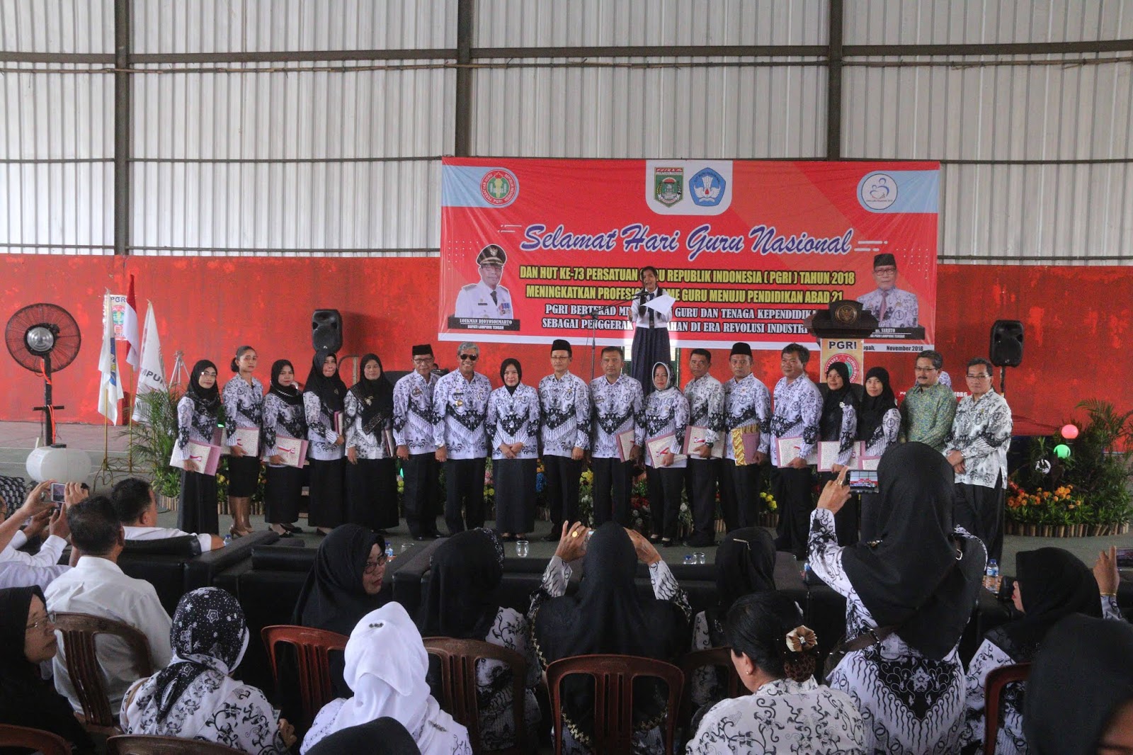 Gunung Sugih - Rapemda 92,8 Fm, Dalam Rangka Puncak Peringatan Hari Guru Nasional ke 24 dan HUT ke 73 PGRI, Ratusan Guru yang ada di kabupaten Lampung Tengah hadir mengadakan kegiatan yang bertemekan menjadikan Guru Sebagai Penggerak Perubahan diera revolusi Industri 4.0 Ditambahkan loekman Guru yang berkualitas akan membentuk pemimpin yang soleh dan solehah. Selain pendidikan, Bupati Gotong Royong ini juga berharap guru juga dapat mendorong kemajuan bidang seni.Olah raga dan lain sebagainya terlebih lagi dibidang Tehnologi dan Informasi, Dari Pantauan Awak Media Puncak Peringatan Hari Guru Nasional ke 24 dan HUT ke 73 PGRI di lakukan pemberian Penghargaan Kepada Dewan Guru yang dilakukan langsung oleh Bupati lampung Tengah Beserta Ibu Hj.Ellya Lucyana Loekman ( Diskominfo)Dalam Laporannya Ketua PGRI Kabuapten Lampung Tengah Drs.Hi.Sarjito melaporkan jumlah anggota PGRI di Lampung Tengah hingga saat sebanyak 14.642 orang sedangkan jumlah guru dilampung tengah sebanyak 19.000, dijelaskan sarjito data tersebut diperoleh dari kartu anggota yang di peroleh dari WebSite Pengurus Besar PGRI yang pengisian datanya dilakukan secara on line, selain itu ditambahkan sarjito sesuai dengan Tema pada Peringatan HUT PGRI tahun 2018 kali ini adalah menjadikan Guru Sebagai Penggerak Perubahan diera revolusi Industri 4.0 hal ini tentunya mangajak kepada kita semua untuk terus belajar sepanjang hayat ditegaskan sarjito sebagai seorang guru tentunya kita tidak boleh lagi gapteg atau gagap tehnologi,seorang guru wajib menguasai tehnologi dan informasi.