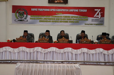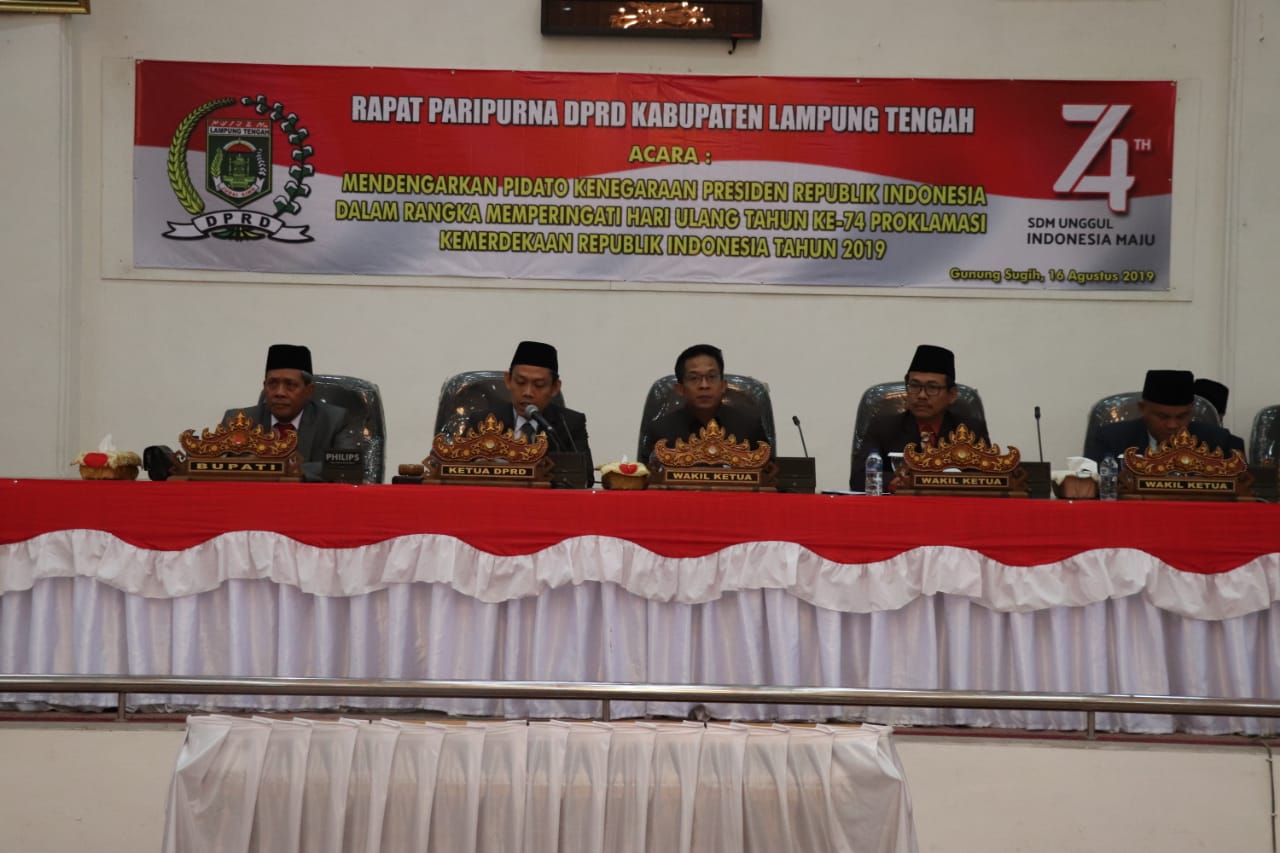 Pidato Kenegaraan Presiden RI Joko Widodo dalam rangka menyambut HUT Republik Indonesia ke-74 tersebut didengarkan bersama dalam rapat paripurna istimewa di DPRD Kabupaten Lampung Tengah. Sebelum Pidato kenegaraan Presiden RI, Plt.Ketua DPRD Febriantoni membuka dan memimpin langsung sidang paripurna istimewa dengan agenda mendengarkan Pidato Kenegaraan Presiden RI Joko Widodo.