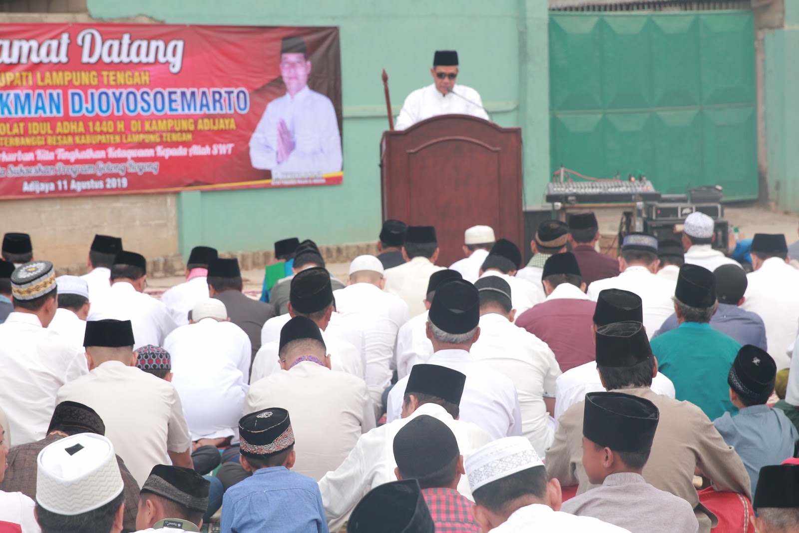 Terbanggi Besar - Rapemda 92'8 FM. Dalam perayaan idhul Adha 10 Zulhijah 1440.H, Bupati Lampung Tengah Loekman Djoyosoemarto Beserta istri Ibu Hj.Ellya Lusiana Loekman dan Pejabat lainnya, Melaksanakan Sholat idhul Adha bersama warga masyarakat di Lapangan masjid Al - Hidayah Adi Jaya terbanggi besar, Minggu 11 Agustus 2019. Dalam Sambutannya Bupati mengingatkan ada empat pelajaran dari Nabi Ibrahim, yaitu pentingnymengalahkan hawa nafsu dengan tauhid, perhatian terhadap negeri, pengorbanan dan perhatian terhadap generasi muda. Ditambahkan Bupati bahwa Nabi Ibrahim adalah contoh yang sempurna dalam mengalahkan hawa nafsunya dalam rangka membuktikan kesetiaan kepada Allah swt. Beliau rela mengembara, menyembelih putranya, melawan rajanya sendiri dan bahkan meninggalkan orang tuanya demi memenuhi perintah Allah. Padahal dibalik kerelaan dan pengorbanan itu Nabi Ibrahim adalah pribadi yang dekat dan sayang dengan semua yang ditinggalkannnya. Selain itu bupati lampung tengah mengingatkan bahwa Hari Raya Idul Adha merupakan momentum yang tepat bagi kita untuk meningkatkan semangat rela dan ikhlas mengorbankan sesuatu yang kita miliki dan kita cintai demi kepentingan yang lebih besar. Sesungguhnya semua hal yang kita miliki, baik harta, keluarga, pangkat, derajat, dan semua nikmat yang kita rasakan pada hakikatnya merupakan titipan dan amanah dari Allah Subhana Wata’ala, yang harus kita syukuri dan kita gunakan sesuai dengan ajaran agama.Ibadah qurban yang kita laksanakan, memberikan pesan penting bahwa pengorbanan apapun yang dilakukan ikhlas semata-mata mengharapkan ridha Allah Subhana Wata’ala disertai dengan sabar dan iklas. Karena Menurut Bupati ibadah qurban mengajarkan kita untuk mencintai sesama, saling menolong, dan saling memberi. Lebih dari itu, secara simbolis, Nabi Ibrahim Alaihissalam Dan Nabi Ismail Alaihissalam memberikan pesan kepada kita semua agar membersihkan hati dan jiwa dari nafsu-nafsu hewani Untuk itu melalui momentum ini, Bupati mengajak kepada para jamaah yabg hadir jadikan ibadah qurban menjadi gaya hidup untuk membantu sesama. Karena orang-orang yang senantiasa berqurban akan memperoleh tempat yang paling tinggi di sisi Allah Subhana Waata’ala. Dan ibadah qurban juga bisa mengantarkan umat islam menjadi umat yang kuat, umat yang tangguh, umat yang memiliki kepedulian kepada sesama. Di akhir sambutannya bupati mengajak jamaah sekalian untuk mendoakan saudara-saudara kita yang sedang melaksanakan ibadah haji, semoga senantiasa diberikan kesehatan dan kekuatan, sehingga dapat kembali ke tanah air dengan sehat walafiat serta predikat haji yang mabrur dan mabrurah.Dalam pelaksanaan sholat Id tersebut, bertindak selaku imam adalah Ustadz Salim. Sedangkan yang bertindak sebagai khatib yakni Ustad Zainal Abidin dan Bilal Eko Prasetyo. Dalam khatibnya,Ustad Zainal Abudin Spd mengajak kepada masyarakat agar senantiasa ikhlas dalam melakukan apapun, rela menyisihkan sebagian rejeki untuk berqurban, sebagaimana cerita tentang keteladanan Nabi Ibrahim pada masanya. Usai Pelaksanaan Sholat Idhul Adha dengan didampingi ibu Hj.Ellya Lusiana Loekman menyerahkan 1 ekor Sapi kepada panitia qurban untuk dibagikan kepada warga masyarakat penerima hewan qurban.( DIskominfo lampung Tengah )