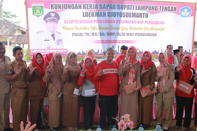 WAY PENGUBUAN, RAPEMDA 92,8 FM - Bupati Lampung Tengah Loekman Djoyosoemarto melakukan pertemuan dengan tenaga pendidik se kecamatan Way Pengubuan yabg terdiri dari guru guru Paud ,TK ,SD, SMP dan SLTA yang bertempat di Lapangan di SMPN 2 Kecamatan Way pengubuan. Beliau berpesan kepada tenaga pendidik untuk menjadikan generasi bangsa menjadi generasi yang berilmu dan bermartabat. Terkait dengan tenaga guru honorer Bupati mengatakan akan terus mengupayakan kesejahteraan bagi tenaga guru honorer. "Tidak semua orang bisa mengajar,sebagai pemimpin daerah saya akan mengupayakan yang terbaik untuk kesejahteraan tenaga guru khusus nya di Lampung Tengah," ungkap nya. Bupati yang murah senyum ini datang dengan disambut sangat meriah oleh guru guru sekecamatan Way Pengubuan. Para guru juga berebut untuk bisa bersalaman dengan Bupati Lampung Tengah Loekman Djoyosoemarto. ( DISKOMINFO LT )