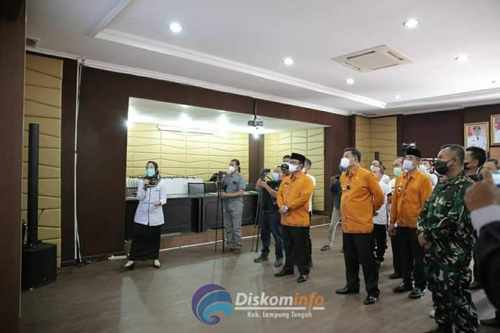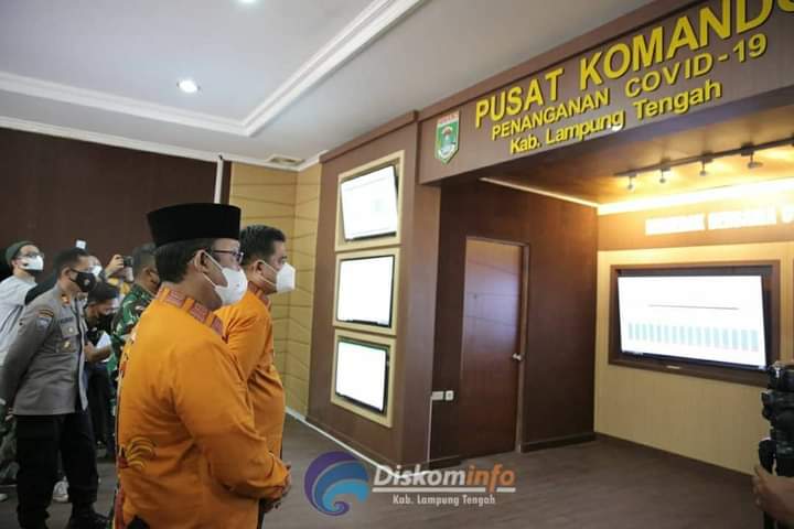 Gunung Sugih Rabu, 08 September 2021 - Bupati Lampung Tengah Musa Ahmad didampingi Wakil Bupati dan Forkopimda Melaunching Pusat Komando Pengandalian Covid-19, ruang tersebut guna memantau kondisi terkini mengenai Covid-19 di Kabupaten Lampung Tengah yang bisa dilihat langsung di ruang tersebut. Ruang Pusat Komando Pengengendalian Covid-19 itu juga akan mengupdate situasi mengenai jumlah terkini oksigen, persediaan tempat tidur di Rumah Sakit dan juga jumlah masyarakat yang telah di vaksin. Masyarakat juga nantinya akan bisa melihat langsung situasi ini di website yang telah disiapkan. Bupati Musa Ahmad mengharapakan dengan adanya Ruang Pusat Komando ini satgas - satgas yang telah di bentuk bisa melakukan langkah apa yang harus dilakukan sehingga masyarakat yang terdampak bisa terbantu. Musa Ahmad juga yakin Lampung Tengah bisa terlepas dari virus Covid-19 ini dengan adanya kesadaran masyarakat dalam penerapan protokol kesehatan. (Diskominfo Kabupaten Lampung Tengah)