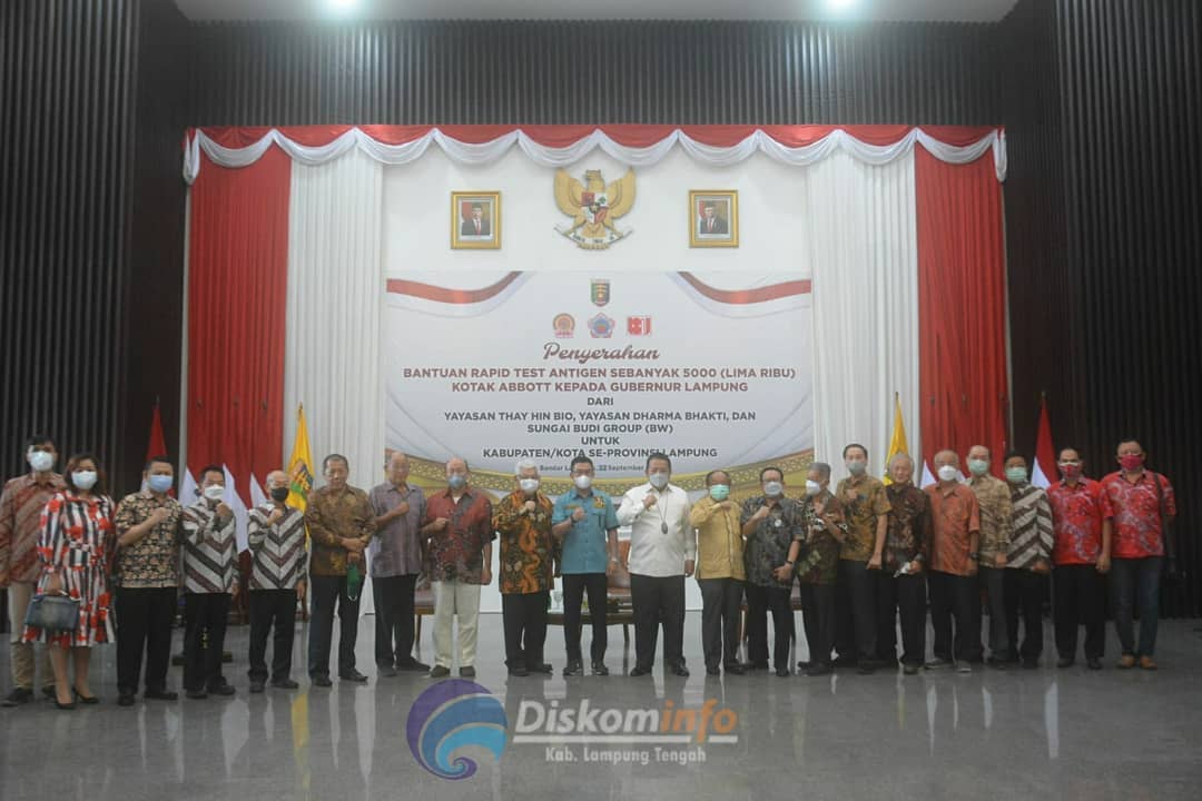 Selasa, 22 September 2021 - Bupati Lampung Tengah, yang dalam hal ini diwakili oleh Sekretaris Daerah Kabupaten Lampung Tengah Nirlan, S.H.,M.M. hadiri acara Penyerahan Bantuan Alat Rapid Tes Antigen secara simbolis oleh Gubernur Lampung, dari Pihak Swasta dan Gubernur Lampung untuk 15 Kabupaten/Kota se-Provinsi Lampung di Mahan Agung Bandar Lampung. Dari 15 Kabupaten/Kota se-Provinsi Lampung salah satunya Kabupaten Lampung Tengah yang mendapatkan bantuan 300 kotak abbott terhadap masyarakat berdampak Covid-19. Bantuan tersebut di terima langsung oleh Sekretaris Daerah Kabupaten Lampung Tengah Nirlan,S.H., M.M. dan di dampingi oleh Kadis Kesehatan dr. Otniel. Dalam sambutannya Gubernur Lampung Arinal Djunaidi mengucapkan terima kasih atas peran swasta yang telah memberikan bantuan Rapid Test Antigen sebanyak 5000 kotak kepada Pemerintah Provinsi Lampung. Untuk 15 Kabupaten/Kota se-Provinsi Lampung. Dengan adanya bantuan ini, Gubernur Lampung mengingatkan untuk Kabupaten/Kota terus melakukan tracing kepada masyarakat. Menurut Gubernur Lampung sudah masuk ke wilayah zona kuning dan itu wajib untuk dipertahankan dan prokes harus tetap dilakukan, seperti menggunakan masker, mencuci tangan, jaga jarak,dan menghindari kerumunan. (Diskominfo Kabupaten Lampung Tengah)