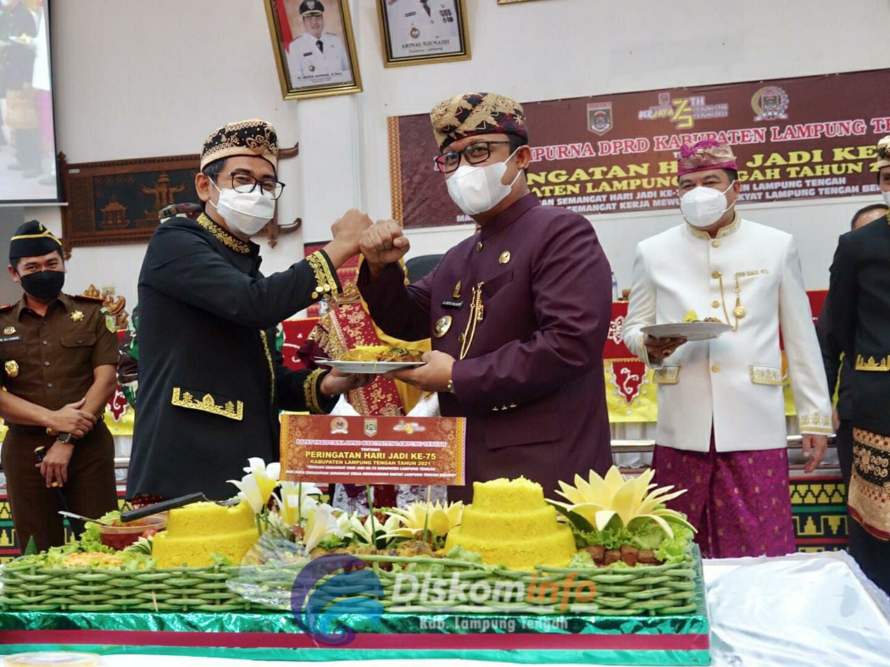 Gunung Sugih - Bupati Lampung Tengah Musa Ahmad dan Wakil Bupati Lampung Tengah Ardito Wijaya menghadiri Rapat Paripurna istimewa peringatan Hari Ulang Tahun ( HUT) ke - 75 Kabupaten Lampung Tengah tahun 2021 di Ruang sidang DPRD Kabupaten Lampung Tengah. (15/06/2021) Dalam pidato sambutannya, Bupati Lampung Tengah Musa Ahmad mengucapkan terima kasih kepada seluruh elemen masyarakat yang mencurahkan bakti daya dan upaya dalam usaha memajukan Kabupaten Lampung Tengah. Peringatan HUT ke - 75 Kabupaten Lampung Tengah ini adalah bukti nyata kerjasama dan hasil kemitraan antara eksekutif dan legislatif dalam menyatukan aspek politik, ekonomi, sosial dan budaya yang tertuang dalam kebijakan daerah yang bermuara kepada komitmen membangun dan memajukan Kabupaten Lampung Tengah. Sebagai penyelenggara pemerintahan tentu akan berupaya bekerja dengan kerja keras dan kerja cerdas serta mencaro terobosan dan inovasi untuk memajukan Lampung Tengah tercinta ini. Berbagai tantangan tentu akan dihadapi namun hal tersebut akan menjadi bagian dari proses dalam pelaksanaan pembangunan dari tahun ke tahun. "Mari kita bersama sama memaknai peringatan HUT Lampung Tengah dengan bersama sama dan bersatu dalam memajukan Kabupaten Lampung Tengah agar semakin berjaya," pesan Musa. (Diskominfo Kabupaten Lampung Tengah)