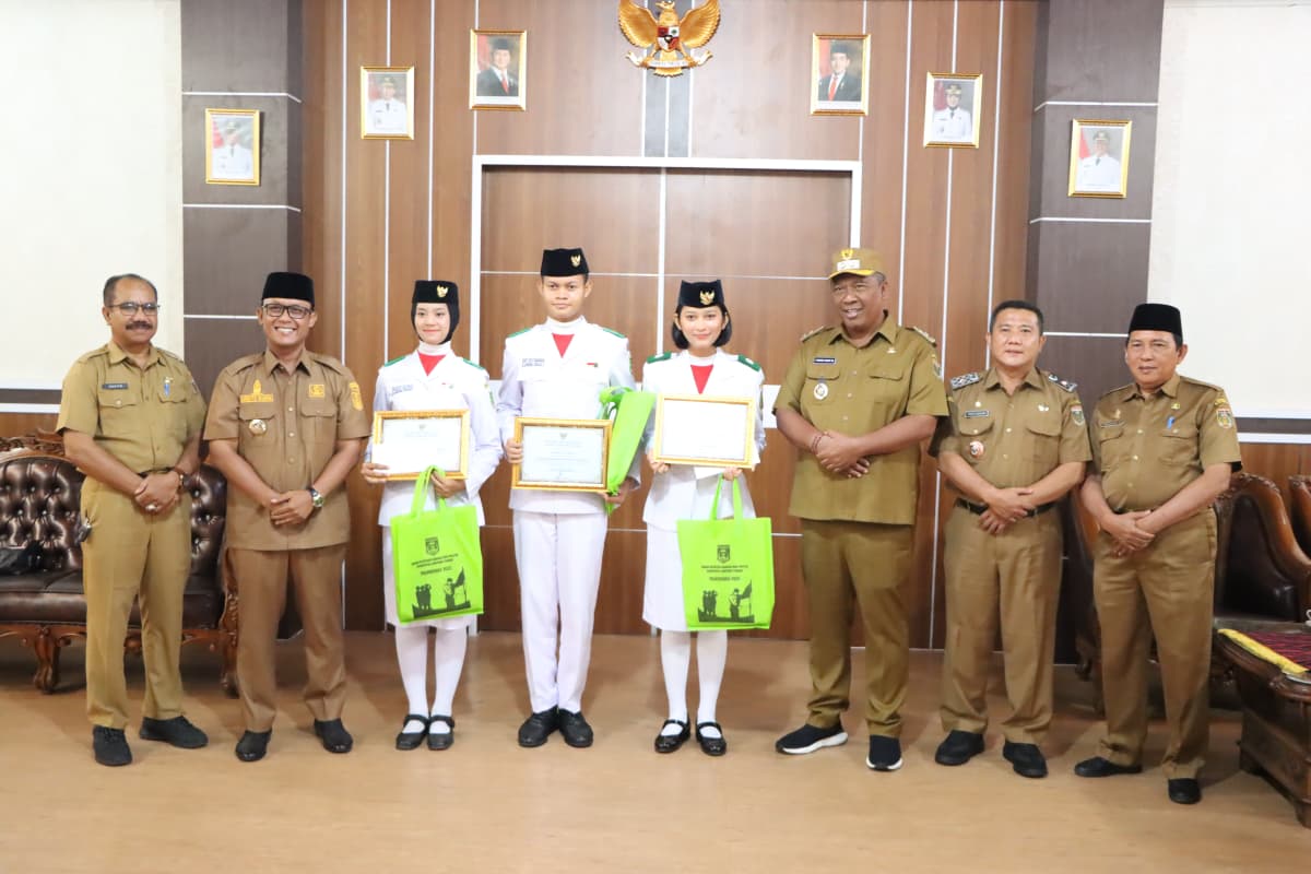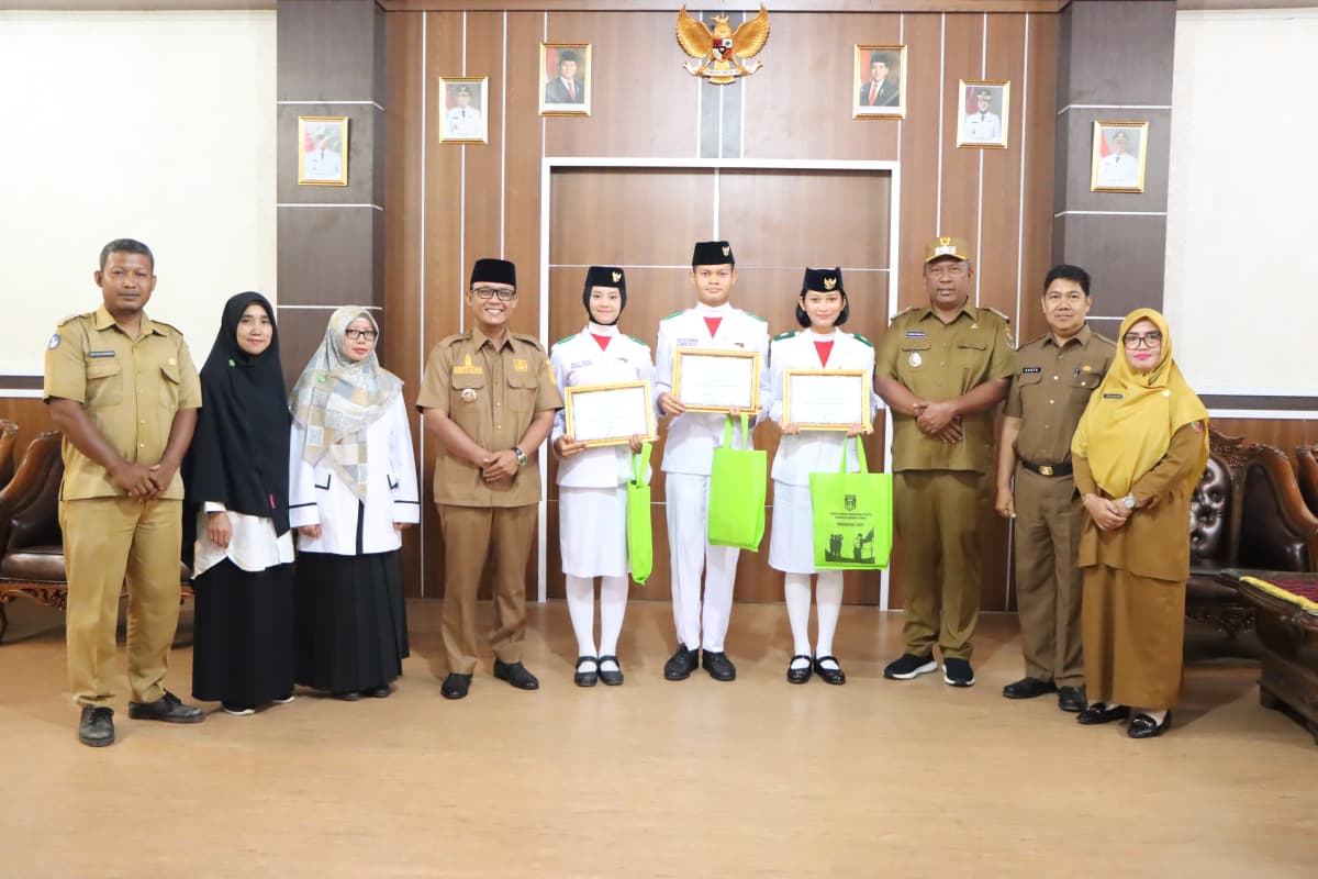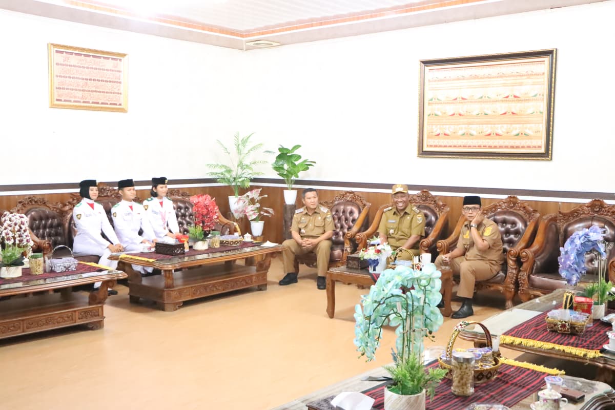 Bupati Lampung Tengah, Ardito Wijaya, bersama Wakil Bupati, I Komang Koheri, menerima audiensi Pasukan Pengibar Bendera Pusaka (Paskibraka) Kabupaten Lampung Tengah yang telah bertugas pada Upacara Peringatan Hari Ulang Tahun Kemerdekaan Republik Indonesia ke-80 Tahun 2025. Pertemuan ini berlangsung pada Selasa (26/08/2025) di Rumah Dinas Bupati Lampung Tengah. Gunung Sugih. Dalam audiensi tersebut hadir para Paskibraka berprestasi asal Lampung Tengah, yakni Nasya Azahra dan Rafa Arya Ramadhan yang bertugas di Provinsi Lampung, serta Ni Made Ira yang mendapatkan kehormatan bertugas di Istana Negara. Bupati Ardito Wijaya dalam arahannya menyampaikan apresiasi dan rasa bangga atas capaian putra-putri terbaik daerah tersebut. “Atas nama Pemerintah Daerah, saya menyampaikan penghargaan setinggi-tingginya kepada ananda semua yang telah membawa nama baik Lampung Tengah di tingkat provinsi hingga nasional. Prestasi ini harus menjadi motivasi bagi generasi muda lainnya untuk terus berdisiplin, berprestasi, dan menjaga semangat nasionalisme,” ujar Bupati Ardito. Sementara itu, Wakil Bupati I Komang Koheri menambahkan bahwa keberhasilan Paskibraka Lampung Tengah tahun ini merupakan bukti nyata bahwa kerja keras, disiplin, dan doa dapat mengantarkan pada prestasi terbaik. “Kami berharap pengalaman ini menjadi bekal berharga bagi ananda semua dalam menatap masa depan. Teruslah menjadi teladan bagi teman sebaya dan masyarakat, khususnya dalam menumbuhkan cinta tanah air dan semangat kebersamaan,” tutur Wakil Bupati. Audiensi ini ditutup dengan pemberian ucapan selamat dan motivasi serta tali asih dari Pemerintah Kabupaten Lampung Tengah kepada ketiga anggota Paskibraka. (Diskominfotik Lampung Tengah)