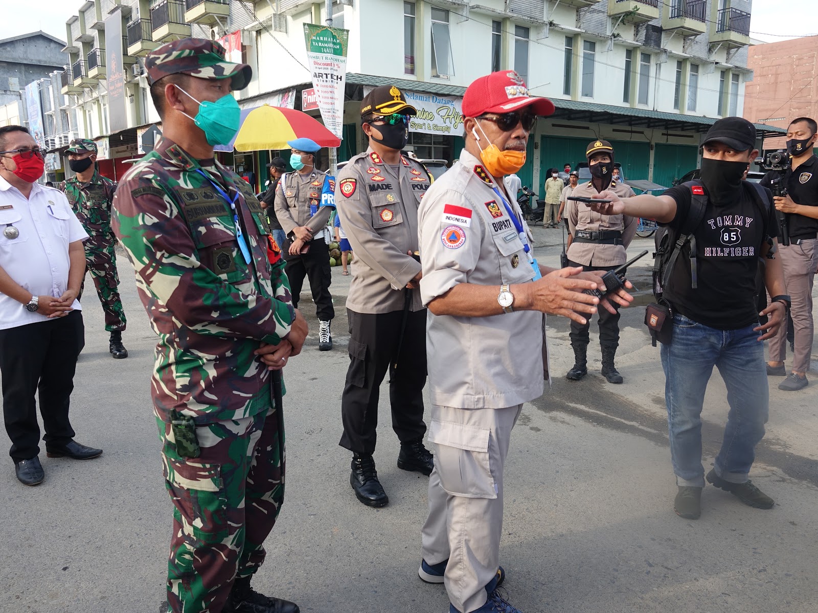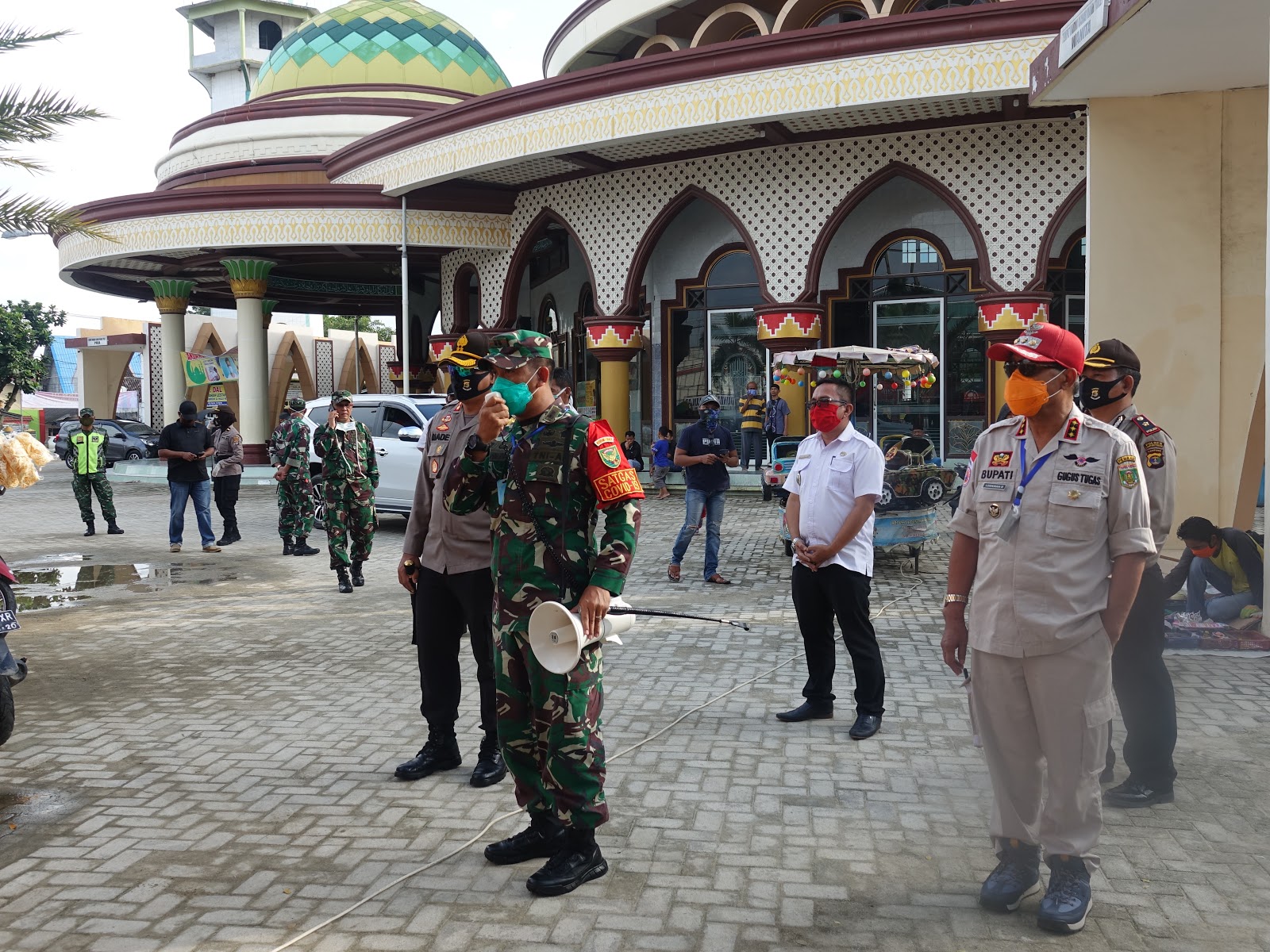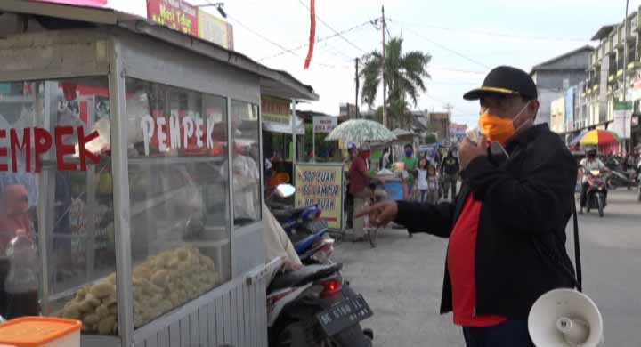 LAMPUNG TENGAH, Ramadhan tahun ini sangat berbeda. Jika pada bulan ramadhan sebelumnya, aktivitas berjalan normal tidak berlaku untuk kali ini. Umat muslim harus melalui bulan ramadhan di tengah Pandemi Virus Corona atau Covid-19. Berbagai upaya telah dilakukan oleh Pemkab Lampung Tengah dalam berupaya melakukan pemutusan mata rantai penyebaran virus corona (Covid-19), salah satunya yaitu warga diminta tetap di rumah, tidak berkerumun dan menjaga jarak. Namun Saat ini masih banyak warga yang berkerumun, terutama saat jelang berbuka puasa. Pantauan di halaman Masjid Agung Istiqlal Bandar jaya, tempat pedagang takjil nampak masih dipadati warga. Protokol kesehatan pun terlupa. Ada yang tidak memakai masker serta menjaga jarak. Melihat kenyataan yang ada di lapangan, Bupati Lampung Tengah Loekman Djoyosoemarto beserta Unsur Forkopimda saat turun langsung melihat ke pasar dadakan di halaman Masjid Agung Istiqlal Bandar Jaya, Rabu 29 April 2020, sore langsung memberikan himbauan kepada para pedagang dan pembeli agar menghentikan aktifitas jual beli makanan berbuka puasa seperti ini. Karena saat ini sedang mewabahnya penularan virus corona (covid-19) yang sangat membahayakan, oleh karena itu mulai besok dilarang berdagang di halaman Masjid Agung Istiqlal ini, demikian disampaikan Komandan Kodim 0411 Lampung Tengah Letkol Inf Burhanudin. Ditambahkan Dandim bahwa besok semua para pedagang takjil akan dipindahkan di belakang Plaza Bandar Jaya dan akan diatur oleh Dinas Pasar tentang jarak antara kios satu dengan kios lainnya dan kepada para pedagang atau pembeli diwajibkan menggunakan masker. Sementara itu Ketua DPRD Lampung Tengah Sumarsono dengan tegas melarang para pedagang yang menjajajakan dagangan di halaman Masjid Istiqlal ini, karena menurut Sumarsono dengan adanya aktifitas semacam ini, tentunya akan memberikan celah dampak yang terburuk kepada para pedagang dan pembili untuk tertular penyebaran virus corona (covid-19). Untuk itu dengan tegas Sumarsono meminta kepada seluruh pedagang dadakan takjil di sepanjang jalan yang ada di halaman Masjid Istiqlal mulau esok hari dan seterusnya agar tidak lagi melakukan aktifitas berjualan baik di halaman maupun disepenjang jalan Masjid Istiqlal Bandar jaya. Dengan nada tinggi Sumarsono mengingatkan kepada para pedagang dan pembeli "Jangan menganggap remeh wabah COVID-19. Jumlah ODP (Orang Dalam Pemantauan) dan PDP (Pasien Di tempat yang sama Bupati Lampung Tengah saat meninjau secara langsung para pedagang dadakan yang menjual takjil atau makanan berbuka puasa, sangat prihatin apa yang dilakukan para pembeli dan penjual saat melakukan aktifitas jual belinya, banyak diantara pedagang dan pembeli yang tidak menggunakan masker, ini sudah menyalahi protokol kesehatan yang dianjurkan oleh pemerintah. Dijelaskan Bupati sedari awal memasuki bulan suci ramadhan dirinya telah melarang para penjual takjil ini melakukan aktifitasnya berdagang di halaman Masjid Istiqlal ini, oleh karena itu Bupati meminta kepada para pedagang untuk tidak berjualan di halaman masjid ini, karena pemerintah telah menyediakan area tempat berjualan yang telah diatur jarak satu dengan yang lainnya kepada masing masing pedagang. Terkait semangkin mewabahnya virus corona di berbagai daerah di Indonesia dengan tugas Bupati beserta TNI dan Polri akan melakukan tindakan tegas bagi para pemudik yang berdatangan di Lampung Tengah harus mengikuti protokol kesehatan yang telah di anjurkan oleh pemerintah, yaitu melakukan karantina mandiri selama 14 hari dirumah. (DISKOMINFO LAMPUNG TENGAH)
