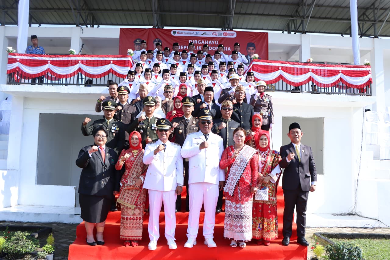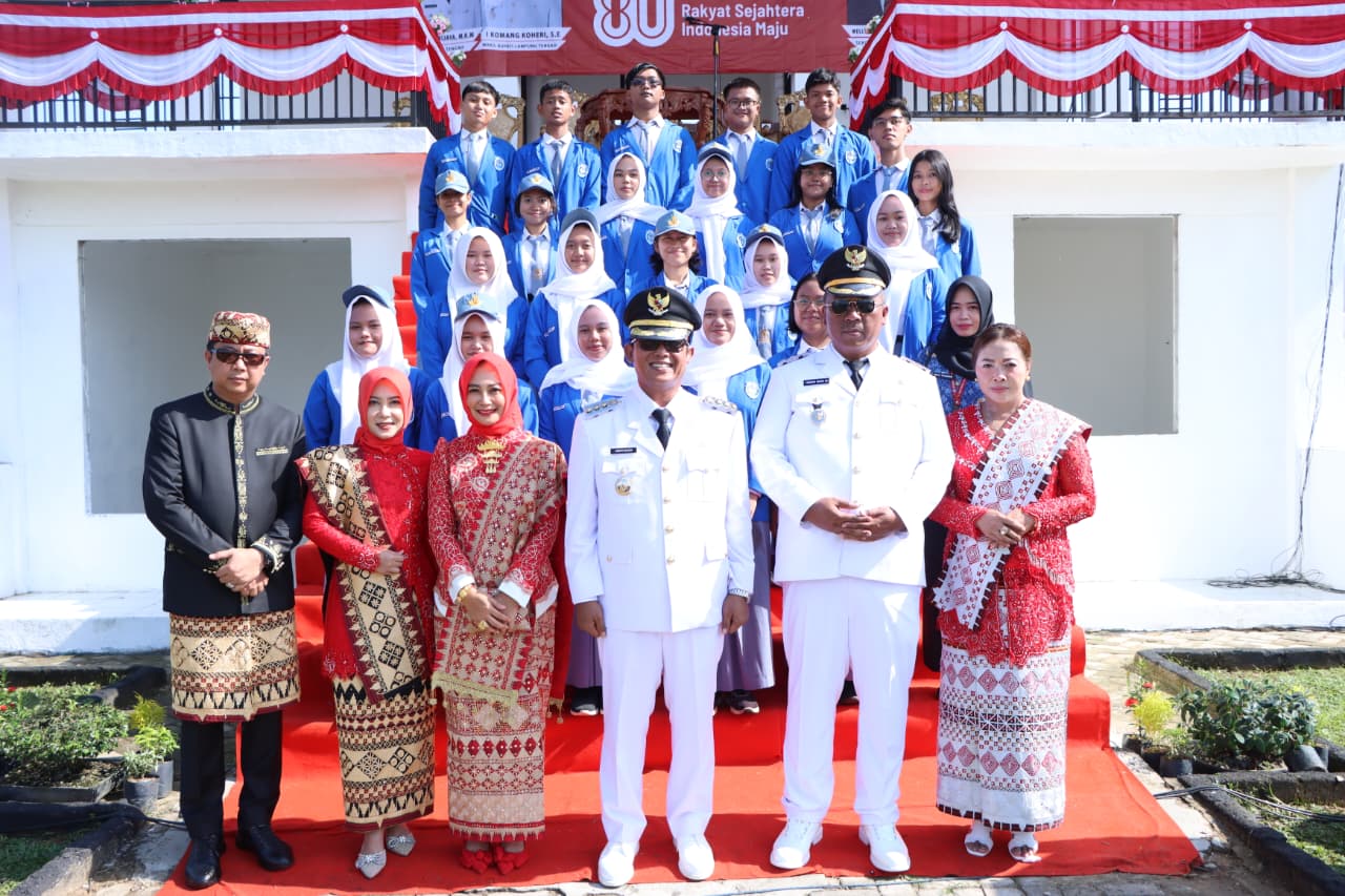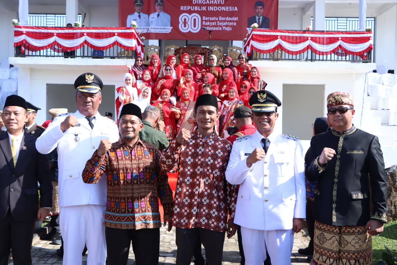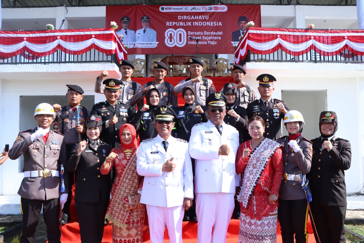 Bupati Lampung Tengah, Ardito Wijaya, untuk pertama kalinya bertindak sebagai Inspektur Upacara (Irup) pada peringatan Hari Ulang Tahun ke-80 Kemerdekaan Republik Indonesia, yang digelar di Lapangan Merdeka, Gunung Sugih, Minggu (17/08/2025). Upacara berlangsung khidmat dan diikuti oleh Wakil Bupati I Komang Koheri, unsur Forkopimda, jajaran ASN, TNI/Polri, pelajar, organisasi kemasyarakatan, serta masyarakat umum. Prosesi pengibaran bendera Merah Putih berjalan lancar dan penuh semangat nasionalisme. Bupati Ardito Wijaya mengajak seluruh masyarakat Lampung Tengah untuk terus menjaga semangat persatuan dan kesatuan bangsa, serta bersama-sama membangun daerah menuju kemajuan yang berkelanjutan. "Peringatan Hari Kemerdekaan ini bukan hanya seremonial, tetapi momentum untuk merefleksikan perjuangan para pahlawan serta meningkatkan kontribusi nyata dalam pembangunan," ujar Bupati. Peringatan HUT ke-80 RI di Lampung Tengah tahun ini mengangkat tema nasional “Indonesia Emas 2045: Bersatu, Bangkit, Maju”, sejalan dengan semangat menuju Indonesia sebagai negara maju dalam dua dekade mendatang. (Diskominfotik Lampung Tengah)