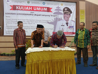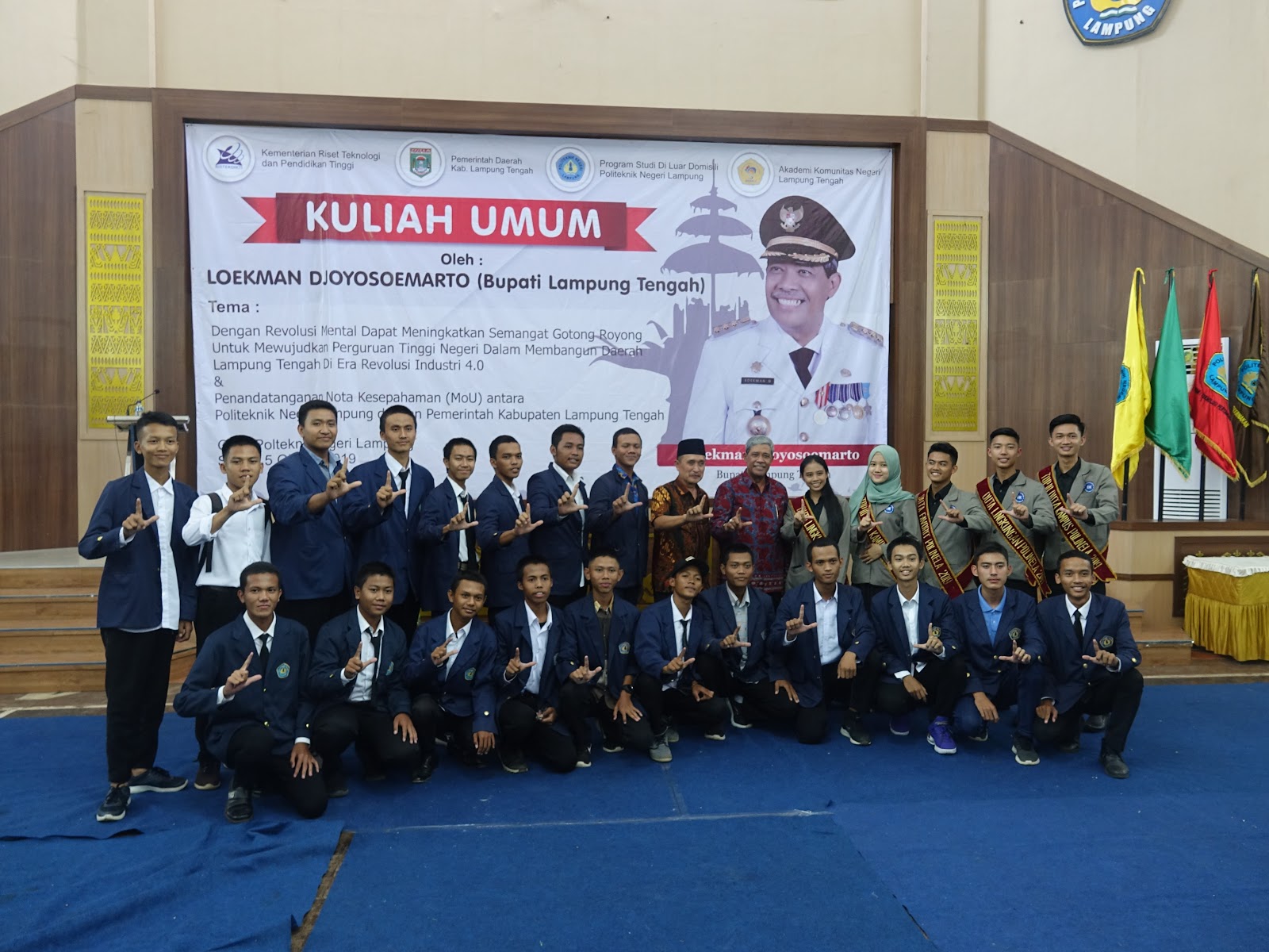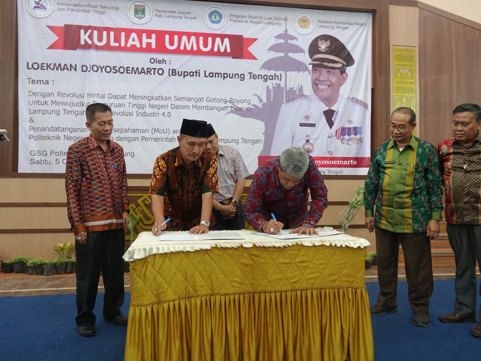 Usai Memberikan Kuliah Umum Nya Kepada Para Mahasiswa Baru Politeknik Negeri Lampung, Bupati Lampung Tengah Loekman Djoyosoemarto Atasnama Pemkab Lampung Tengah Dan Ir. Sarono M.Si Atas Nama Politehnik Negeri Lampung Melakukan Penanda Tangan Nota Kesepahaman Atau Mou Untuk Pengembangan Kampus 2 Politehnik Negeri Lampung Di Kabupaten Lampung Tengah. Sebelum Meninggalkan Gedung Serga Guna Politeknik Negeri Lampung Kapada Awak Media Bupati Lampung Tengah Loekman Djoyosoemarto Menjelaskan Bahwa Mataeri Kuliah Umum Yang Disampaikan Kepada Mahasiswa Ditekankan Pada Kegiatan Gotong Royong Dan Memberi Motipasi Kepada Mahasiswa Untuk Menghidupkan Kembali Kehidupan Secara Bergotong Royong. Ditempat Yang Sama Salah Satu Mahasiswi Politknik Negeri Semester 3 Yang Juga Seorang Mahasiswi Yang Menjadi Duta Favorit Politeknik Negeri Lampung Alinsa, Mengatakan Bahwa Dirinya Dan Rekan Rekan Mahasiswa dan Mahasiswi Merasa Senang Dan Bangga Menerima Materi Kuliah Umum Dari Seorang Bupati. Alinsa Menjelaskan Bupati Lampung Tengah Loekman Djoyosoemarto Adalah Seorang Pemimpin Yang Sangat Luar Biasa Yang Bisa Mengayomi Wrga Masyarakatnya. ( DISKOMINFO LAMPUNG TENGAH )