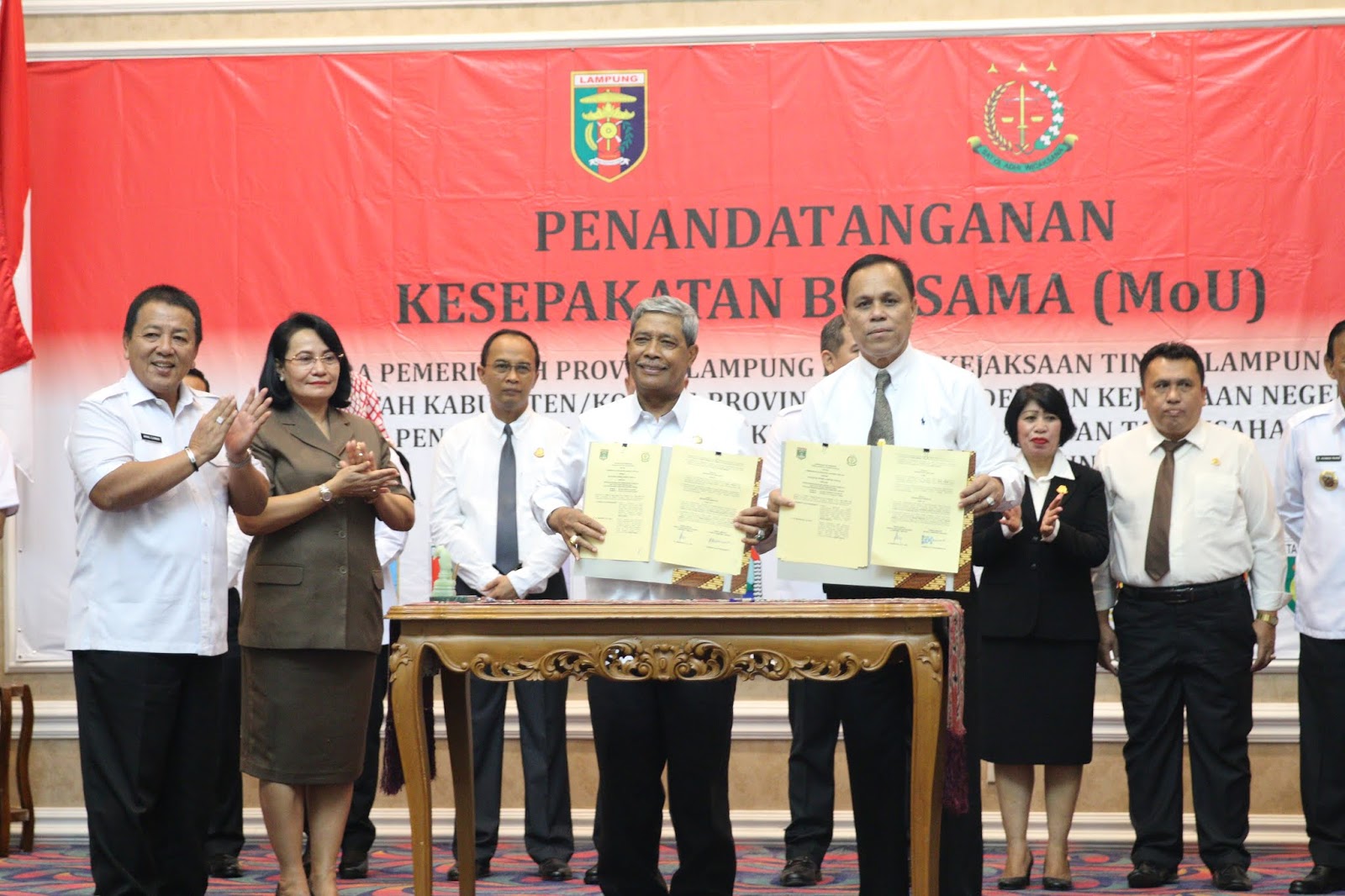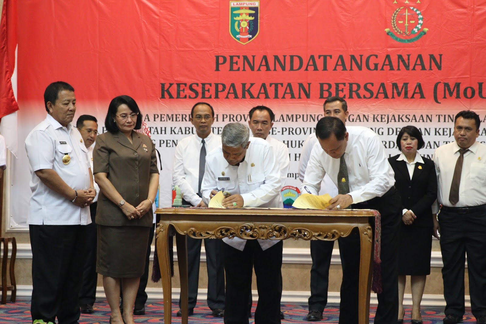 BANDAR LAMPUNG, Bupati Lampung Tengah menghadiri acara penandatanganan kesepakatan bersama antara Gubernur dengan Kepala Kejaksaan Tinggi Lampung dan atara Bupati/Walikota se Provinsi Lampung dengan Kepala Kejaksaan Negeri se Lampung tentang penanganan masalah hukum bidang perdata dan tata usaha negara pada wilayah hukum Provinsi Lampung di Balai Keratun Pemprov Lampung (05/02/2020) Kepala Kejaksaan Tinggi Lampung Diah Srikanti S.H ., M.H dalam sambutannya mengatakan bahwa tugas kejaksaan meningkatkan komitmen dalam meningkatkan pelayanan optimal kepada masyarakat. Sementar itu Gubenur Lampung Arinal Djunaidi dalam sambutannya mengapresiasi penuh dengan kesepakatan ini. "Saya apresiasi dengan kerjasama ini dan semoga kedepan lebih baik," ujar nya. Bupati Lampung Tengah Loekman Djoyosoemarto kepada awak media mengatakan bahwa kerjasama tentang penanganan masalah hukum bidang perdata dan tata usaha negara ini merupakan hal yang sangat membantu terutama pemerintah daerah. Banyak sengketa yang tidak dapat diselesaikan oleh pemerintah daerah, maka dengan adanya kerjasama ini diharapkan dapat membantu menyelesaikan permasalahan permasalahan yang ada. Loekman mengatakan bahwa kerjasama ini diharapkan dapat dimanfaatkan secara optimal. "Kerjasama ini diharapkan semakin optimal berdasarkan apa yang menjadi kepentingan masyarakat," ujar Loekman. Kajari juga diharapkan berbuat maksimal untuk masyarakat sesuai dengan fungsi nya diantaranya bantuan hukum, pertimbangan hukum, pelayanan hukum. (DISKOMINFO LAMPUNG TENGAH)