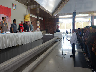 GUNUNGSUGIH - RAPEMDA 92,8 FM, Bupati Lampung Tengah Loekman Djoyosoemarto menghadiri deklarasi damai pemilihan kepala kampung serentak Kabupaten Lampung Tengah tahun 2019 di gedung sesat agung Kabupaten Lampung Tengah Kamis 31 Oktober 2019. Sebagaimana diketahui bahwa pemilihan kepala kampung serentak akan dilaksanakan pada 7 November 2019 yang terdiri dari 168 kampung dengan jumlah calon 572 orang.Terdapat 19 kampung yang jumlah calonnya lebih dari lima orang, hal ini dilaporkan oleh Kepala Dinas PMK kabupaten Lampung Tengah Firdaus Rokain MM. Masih diterangkan Firdaus bahwa mulai tanggal 1 s.d. 3 November merupakan masa kampanye, sedangkan tanggal 4 s.d. 6 November merupakan masa tenang dan tanggal 7 November 2019, merupakan hari pemilihan Acara ini dihadiri oleh forkompinda Kabupaten Lampung Tengah, anggota DPRD provinsi Lampung organisasi partai, camat sekabupaten Lampung Tengah, dan kepala OPD sekabupaten Lampung Tengah. Bupati Lampung Tengah Loekman Djoyosoemarto dalam sambutannya menyampaikan bahwa Kabupaten Lampung Tengah merupakan kabupaten terluas dan terbanyak penduduknya di Provinsi Lampung. Terkait hal tersebut Bupati menjelaskan bahwa visi Kabupaten Lampung Tengah adalah menjadi Kabupaten yang aman, maju, sejahtera dan berkeadilan. Selanjutnya Loekman Djoyosoemarto menekankan bahwa di bawah kepemimpinannya ada tiga hal yang menjadi skala perioritas yaitu pendidikan, kesehatan, dan rumpun pertanian. Bupati Loekman juga menjelaskan kepada para anggota DPRD Provinsi Lampung yang sedang reses bahwa Lampung Tengah sangat perlu dan mendesak untuk pembangunan infrastruktur jalan. Jumlah penduduk yang banyak dan wilayah yang sangat luas, Bupati Loekman telah melaksanakan MoU untuk berdirinya PT Politeknik di Lampung Tengah. Loekman juga telah MoU dengan UGM tentang penerimaan mahasiswa yang akan diterima secara langsung ke UGM, tanpa tes dan hanya cukup diseleksi oleh Pemkab Lampung Tengah. Bupati Loekman selaku pimpinan daerah akan menanggung biaya UKT mahasiswa dari Lampung Tengah yang akan dikirim ke UGM dengan skala priorotasnya adalah untuk bidang ilmu yang masih sangat diperlukan di Lampung Tengaj seperti dokter gigi, tenaga kepariwisataan, teknik, dan lainnya. Bupati Lampung Tengah mengingatkan kepada calon Kakam untuk dapat melakukan demokrasi pemilihan Kakam dilaksanakan dengan tanggungjawab dan bermartabat. Harapannya pelaksanaan Pilkakam dilaksanakan dengan luber dan bersih."Saya tidak berpihak kepada siapapun semua calon sama di mata saya,oleh karena itu mari kita ciptakan suasana pilkakam kondusif," tegas Loekman. Loekman juga meminta agar saat pelaksanaan pilkakam serentak nanti tidak akan terjadi gesekan gesekan, tetapi semua dapat hidup harmonis dan siapapun yang terpilih merupakan pimpinan kita bersama, kita harus hidup secara damai, sehingga Lampung Tengah menjadi Kabupaten yang paling hebat dibanding kabupaten lainnya. Sementara itu Kapolres Lampung Tengah I Made Rasma SIK juga mengatakan akan menindak bagi siapapun pihak yang diketahui memicu tindak kriminal selama pilkakam berlangsung. " Mari ciptakan pilkakam Lampung Tengah damai dan kondusif, " ujar I Made Rasma. Acara dilanjutkan dengan pembacaan deklarasi pilkakam damai serentak yang diikuti oleh seluruh calon kepala kampung yang kn mengikuti pemilihan kepala kampung 7 Novem ber 2019 mendatang (DISKOMINFO LAMPUNG TENGAH )