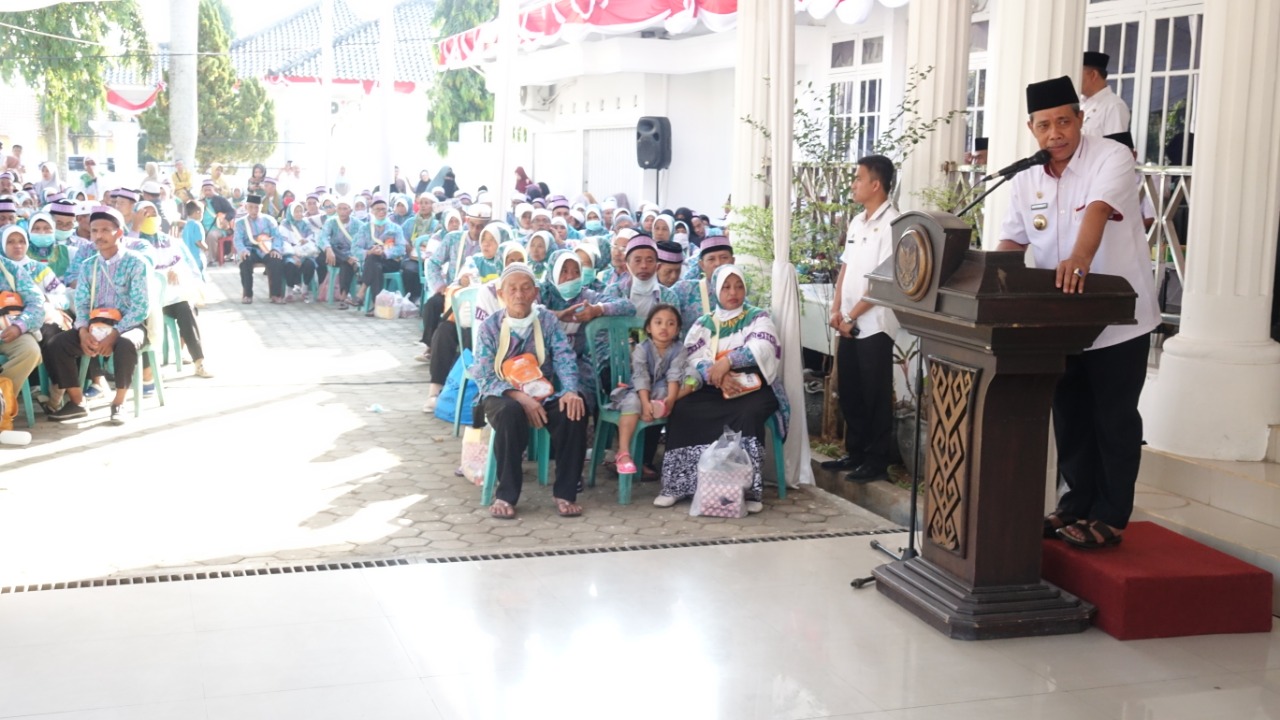 GUNUNG SUGIH - Bupati Lampung Tengah Loekman Djoyosoemarto didampingi Sekda Adi Erlansyah menyambut kepulangan jamaah haji kloter 37 asal Lampung Tengah yang telah tiba di Tanah air, di Rumah Dinas Wakil Bupati, Rabu (04/09/2019). Petugas haji kloter 37 kabupaten Lampung Tengah, Drs H Syaibani dalam laporan nya menyebutkan bahwa dari total 385 jemaah haji yang tergabung dalam kloter 37 terdapat 2 jemaah haji yang sakit, yaitu H. Samsi asal Sriwijaya Mataram dan H. Suwito asal Yukum jaya. Bupati Lampung Tengah Loekman Djoyosoemarto menyambut langsung datangnya rombongan kedua atau kloter 37 asal Lampung Tengah. Dalam sambutan nya Bupati mengucap selamat datang di tanah air kepada seluruh jemaah haji kloter 37 asal kabupaten Lampung Tengah. “Alhamdulillah, kloter 37 pulang dengan formasi lengkap meskipun ada 2 orang Jamaah Haji yang sakit namun semua sampai dengan selamat," ujar bupati ( Diskominfo Lampung Tengah )