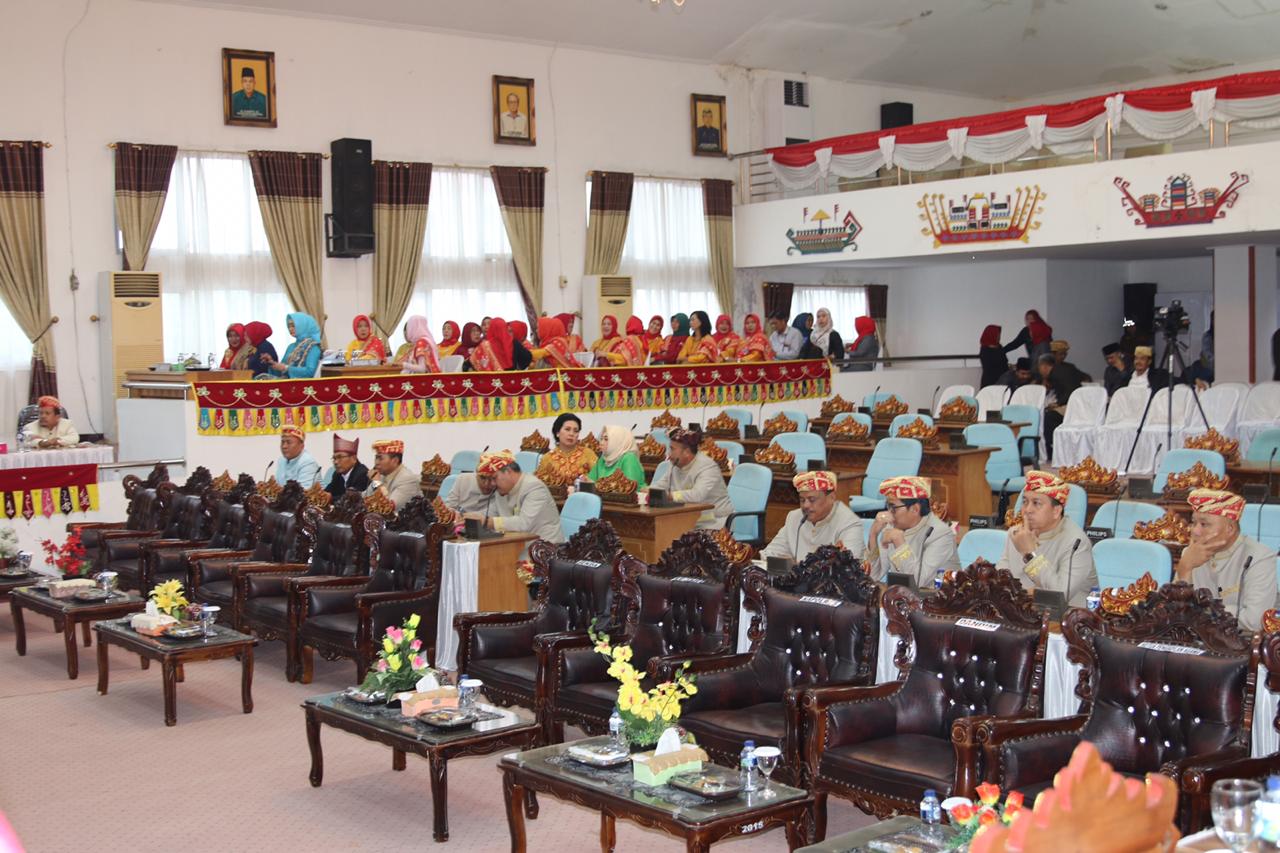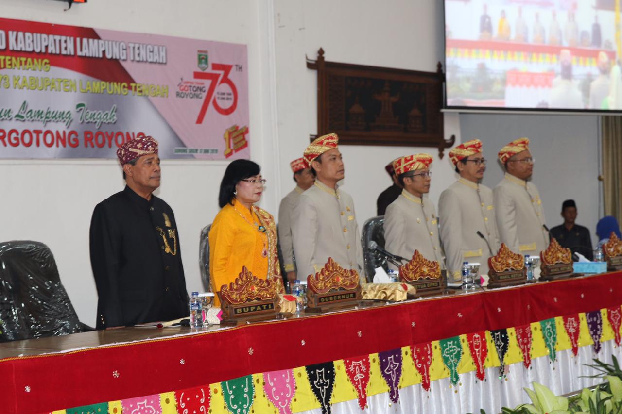 LAMPUNG TENGAH - RAPEMDA 92,8 FM, Dewan Perwakilan Rakyat Daerah (DPRD) Kabupaten Lampung Tengah (Lamteng) menggelar Rapat Paripurna peringatan Hari Ulang Tahun (HUT) Lamteng ke - 73, dengan tema "Kita Bangun Lamteng Dengan Bergotong Royong", di Gedung Dewan setempat, Senin 17 Juni 2019. Rapat Paripurna dipimpin langsung Pelaksana tugas (Plt) Ketua DPRD Lamteng Febriyantoni, didampingi Plt. Wakil Ketua I Wahyudi, Wakil Ketua II Riagus Ria, dan Wakik Ketua III Joni Hardito, serta para Anggota Dewan dan Sekretaris DPRD Lamteng Syamsi Roli. Paripurna juga turut dihadiri Staf Ahli Gubernur Lampung Bidang Ekonomi dan Pembangunan, Theresia, mewakili Gubernur Arinal Djunaidi, Bupati Lamteng Loekman Djoyosoemarto, Sekretaris Daerah Adhi Erlansyah, para Asisten dan Staf Ahli Bupati, para Kepala SKPD, Jajaran Forkopimda, para Tokoh Agama, Adat dan Masyarakat, se- Lamteng. Paripurna dimulai dengan pembacaan singkat sejarah Kabupaten Lamung Tengah oleh Sekretaris Daerah Adhi Erlansyah. Kemudian dilanjutkan dengan sambutan Bupati Lamteng Loekman Djoyosoemarto. Dalam sambutannya, Bupati Loekman mengatakan, untuk mewujudkan Lamteng yang lebih maju dan lebih baik, tentunya tidak dapat dilakukannya saja. Namun diperlukan kerjasama yang baik, dan komitmen bersama dengan stakeholder, serta seluruh unsur elemen masyarakat. "Memasuki usia yang terbilang cukup tua, saya minta seluruh stakholder berpikir dan bekerja keras dan cerdas, serta mencari terobosan-terobosan atau inovasi, agar Lamteng kedepan menjadi lebih baik. Saya juga mengajak seluruh elemen masyarakat melalui sidang paripurna ini, untuk meningkatkan sinergisitas, persatuan dan kesatuan untuk sama-sama memiliki. Lamteng ini adalah milik kita bersama," ujar bupati. Selaku pimpinan daerah, Loekman mengajak semua elemen mensosialisasikan kepada masyarakat Lamteng agar selalu hidup rukun, saling sayang menyayangi, saling membantu, menjaga tali silaturahmi antar sesama, serta menegakkan panji-panji demokrasi. "Kita juga harus kembali menghidupkan budaya gotongroyong, untuk Kabupaten Lamteng yang lebih baik lagi kedepan," harap orang nomor satu di Bumi Beguai Jejamo Wawai ini. Loekman juga mengajak seluruh perangkat di dalamnya, seluruh stakeholder internal maupun eksternal, bersatu dalam satu kebulatan tekad menghidupkan demokrasi yang kuat, membangun masyarakat, khususnya untuk kesejahteraan dan kemakmuran masyarakat Lamteng. "Demokrasi merupakan dasar dan jalan bagi sebuah bangsa untuk mencapai kesejahteraan dan kemakmurannya. Demokrasi juga telah menciptakan ikatan dalam melaksanakan pembangunan nasional. Oleh karenanya, mari kita benar-benar suci untuk bersatu. Marilah kita sama-sama mengutamakan kepentingan masyarakat dan bekerja dengan konstruktif, untuk membangun Lamteng yang lebih baik lagi," pungkasnya. ( DISKOMINFO LAMPUNG TENGAH )