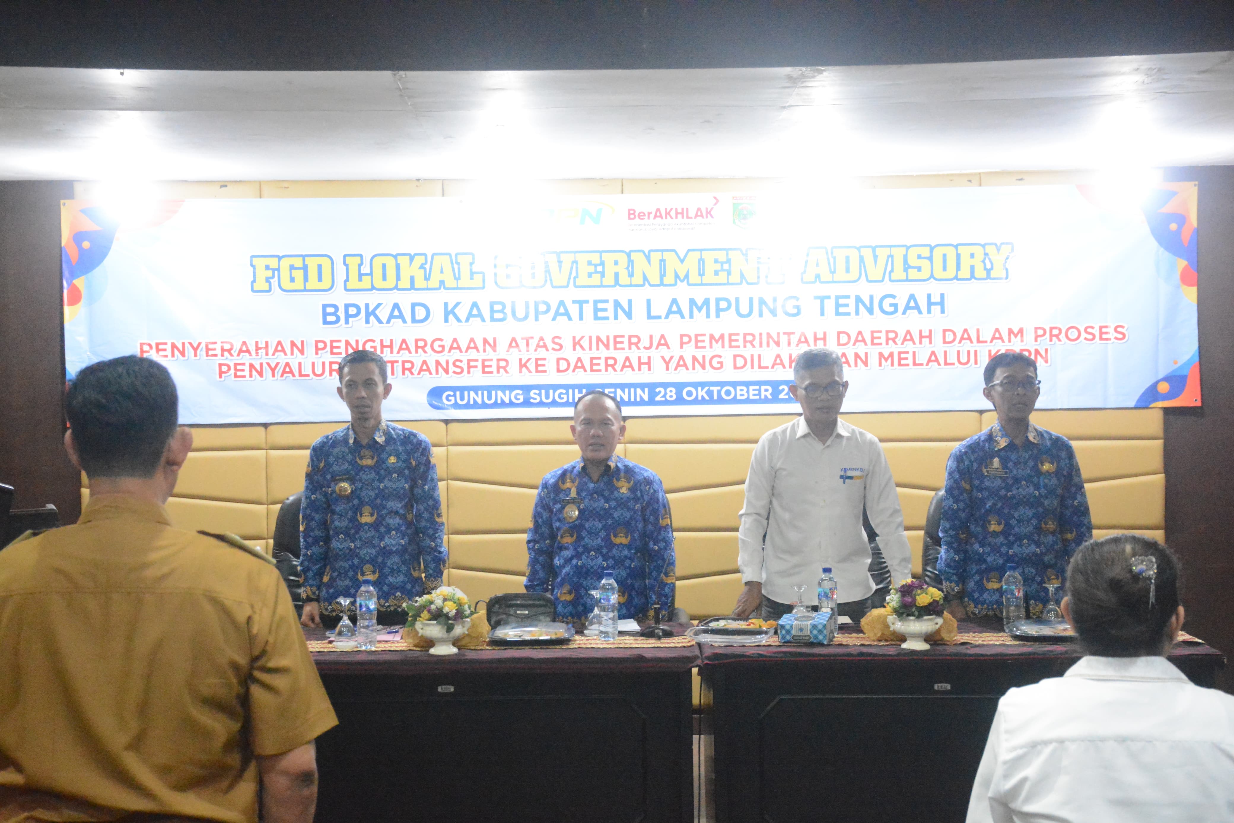 Pemerintah Kabupaten (Pemkab) Lampung Tengah (Lamteng) melalui Badan Pengelola Keuangan dan Aset Daerah (BPKAD) Lamteng menyelenggarakan kegiatan Focus Group Discussion (FGD) Local Government Financial Advisor. Bertempat di Ruang Rapat BJW Komplek Rumdis Bupati Lamteng, Gunung Sugih. Senin (28/10/2024). Hadir dalam kegiatan tersebut, antara lain, Staf Ahli Bupati Bidang Pemerintahan, Hukum dan Politik, Zulfikar Irwan, S.Sos, M.M, mewakili Pjs. Bupati Lamteng, Kepala Kantor Pelayanan Perbendaharaan Negara (KPPN) Metro, Wawan Hermawan, Kepala BPKAD Lamteng, Irfan Toga Setiawan, S.E, M.M, Sekretaris Dinas PMK Lamteng, Purwanto, S.Sos, M.IP dan Peserta dari Kepala Kampung. Staf Ahli Bupati, Zulfikar Irwan dalam membacakan sambutan tertulis Pjs. Bupati Lamteng mengatakan Kegiatan Focus Group Discussion (FGD) Local Government Financial Advisor adalah kegiatan yang dilakukan untuk membahas pengelolaan keuangan daerah. Kemudian, Zulfikar Irwan menjelaskan FGD dilaksanakan sebagai respons atas sejumlah arahan yang tertuang dalam Nota Dinas dari Kementerian Keuangan, terkait rekonsiliasi dan optimalisasi Dana Alokasi Khusus (DAK) Fisik. Selain itu, kegiatan tersebut juga menjadi momentum bagi Pemkab Lamteng untuk menegaskan komitmennya dalam mewujudkan Zona Integritas Wilayah Birokrasi yang Bersih dan Melayani. Sedangkan, Kepala KPPN Metro, Wawan Hermawan dalam sambutannya menjelaskan KPPN berperan sebagai penasihat strategis, memfasilitasi pemerintah daerah dalam mencapai efektivitas dan efisiensi dalam pengelolaan dana transfer. Dalam kegiatan tersebut dilakukan Penyerahan Penghargaan atas kinerja pemerintah daerah dalam proses penyaluran transfer ke daerah yang dilakukan melalui KPPN. (Diskomoinfotik Lampung Tengah)