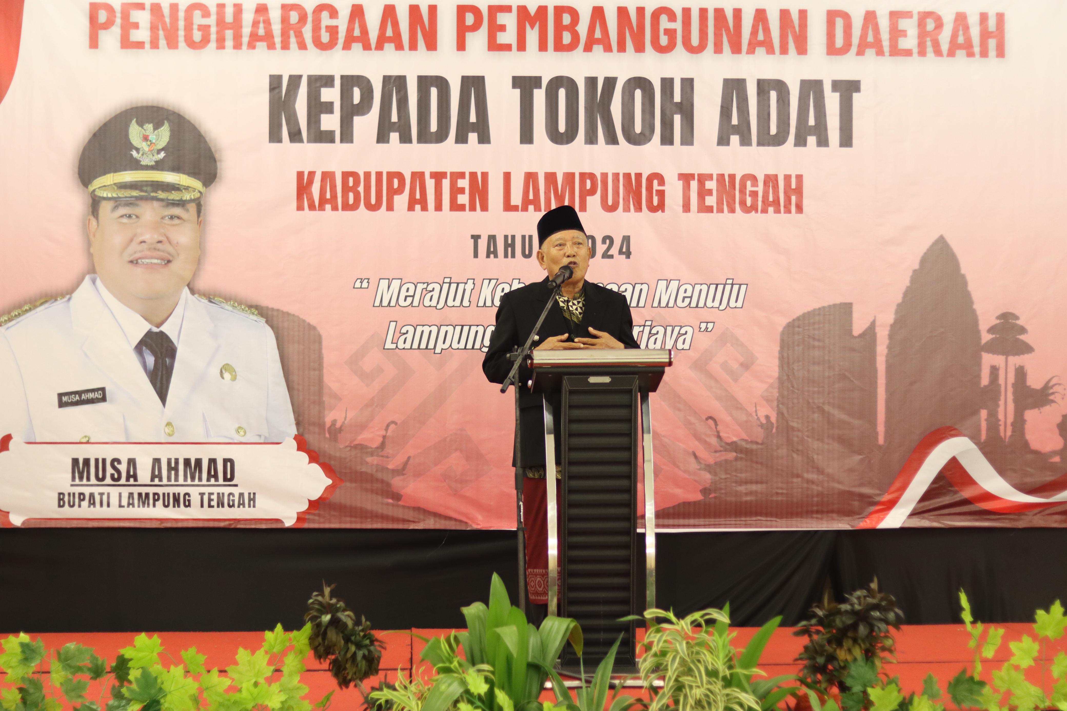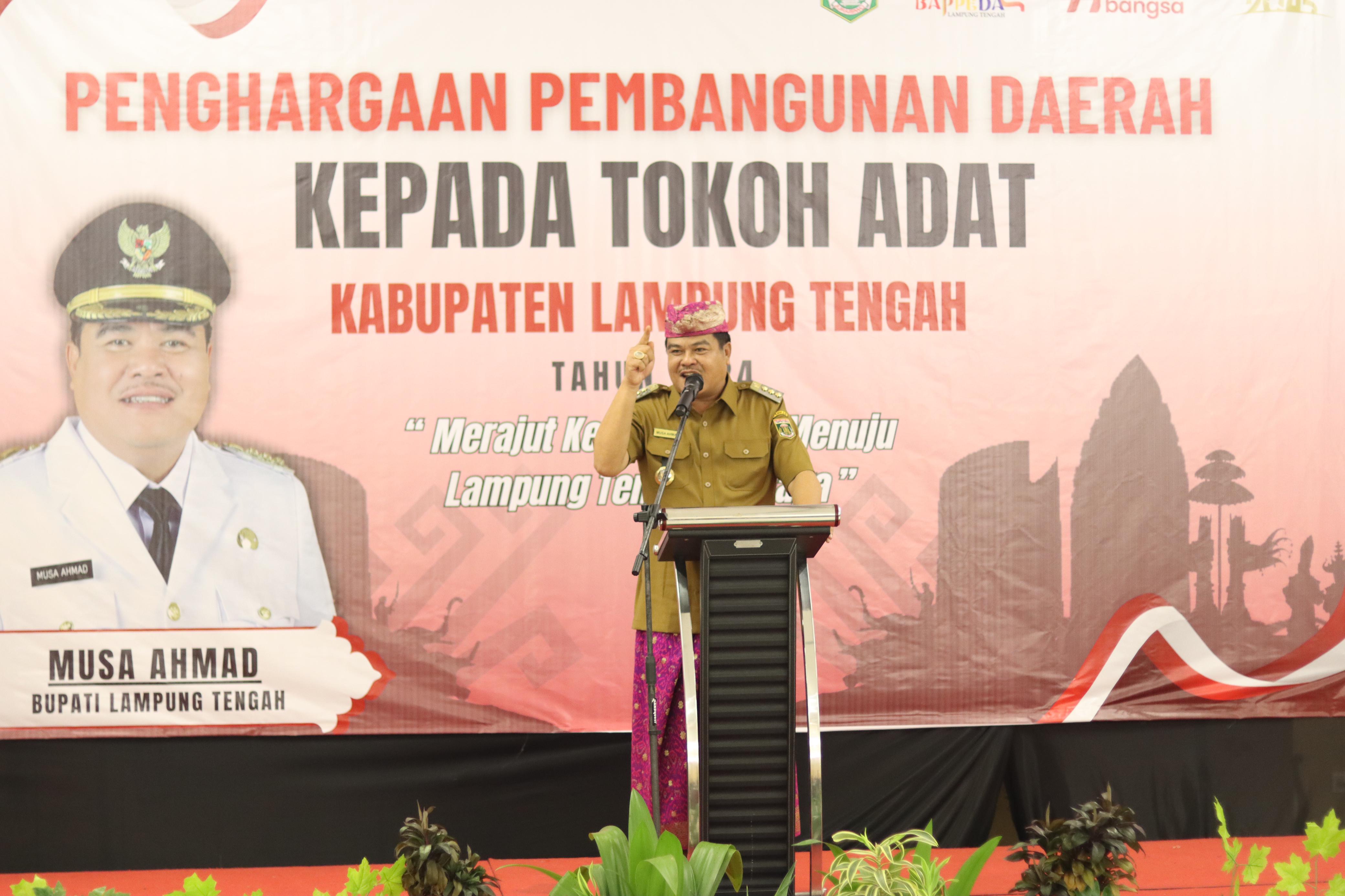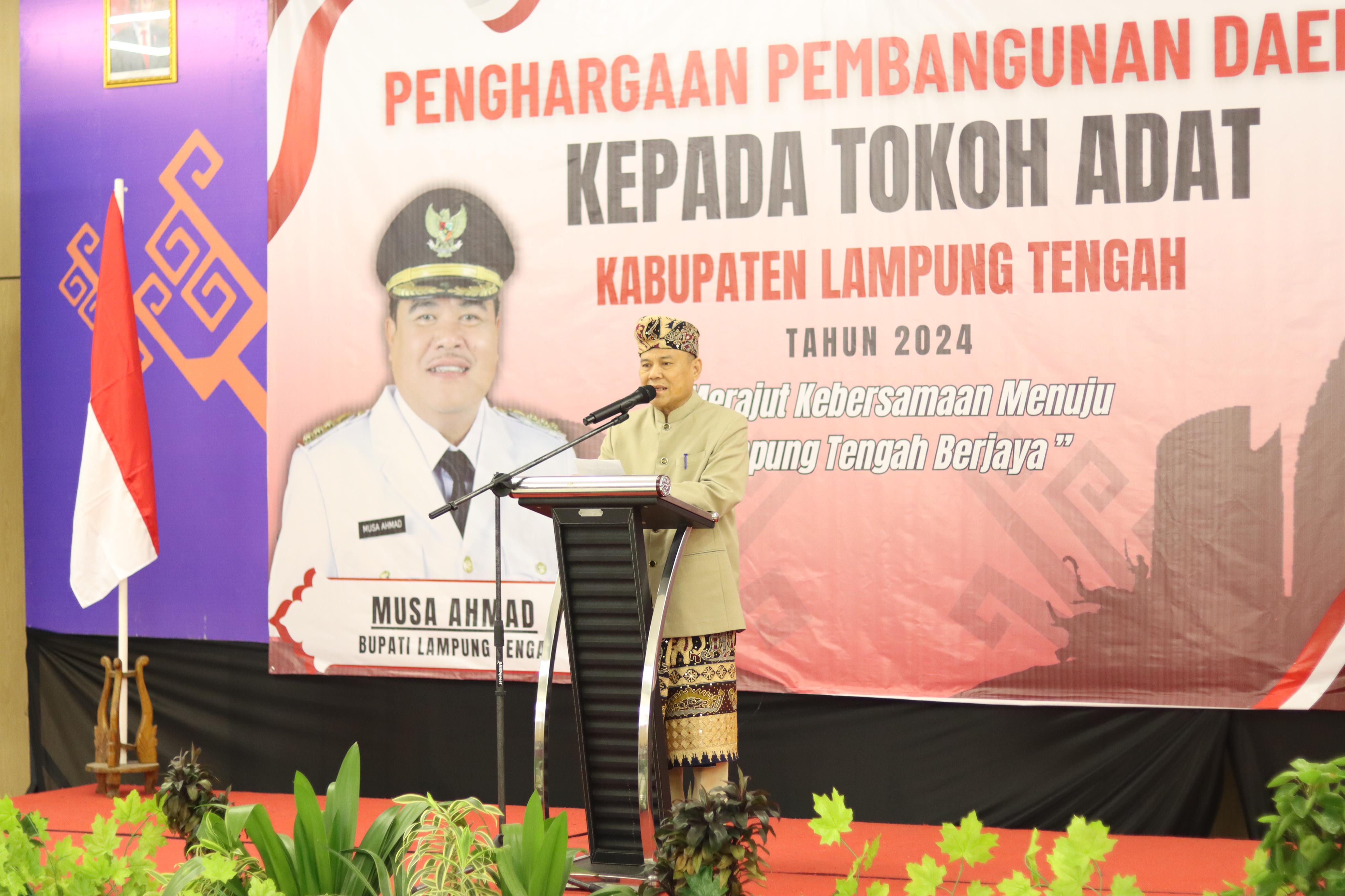 Sebanyak 150 Tokoh adat di kabupaten Lampung Tengah terima penghargaan Pembangunan Daerah kepada Tokoh Adat yang di berikan langsung oleh Bupati Lampung Tengah H. Musa Ahmad, S. Sos., M.M. di hotel BBC, Selasa (4/6/2024). Hadir pada acara tersebut Forkopimda Lampung Tengah, Kepala Dinas Terkait di kabupaten lampung tengah, Forum camat Se-Kabupaten Lampung Tengah serta 150 Tokoh adat yang menerima penghargaan. Penghargaan tersebut di berikan kepada Tokoh adat yang telah memberikan kontribusi dan dedikasinya terhadap kemajuan dan Pembangunan di Kabupaten Lampung Tengah. Bupati Lampung Tengah mengatakan, penghargaan diberikan sebagai bentuk apresiasi pemerintah kepada mereka yang telah berdedikasi dan memberikan kontribusi positif bagi kemajuan pembangunan Kabupaten Lampung Tengah, sehingga dapat memotivasi masyarakat lainnya untuk juga melakukan hal yang sama. Dalam acara tersebut bupati lampung tengah berharap pada acara tersebut berdampak dalam menciptakan perencanaan pembangunan yang komprehensif, berkelanjutan, mampu merekam kebutuhan dan aspirasi masyarakat, serta menentukan skala prioritas pembangunan. Salah satu tokoh adat dari Kampug Terbanggi Besar mengucapkan terimakasih kepada bapak bupati lampung tengah khususnya Pemerintah Kabupaten lampung tengah yang telah melibatkan seluruh masyarakat dan tokoh adat untuk pembangunan yang ada di kabupaten lampung tengah. Dirinya juga menegaskan komitmennya untuk terus mendukung pelestarian dan pengembangan budaya lampung serta pembangunan di kabupaten lampung tengah dan mempererat hubungan antara pemerintah kabupaten dan tokoh-tokoh adat serta masyarakat demi kemajuan lampung tengah yang berjaya. (Diskominfotik Lampung Tengah)