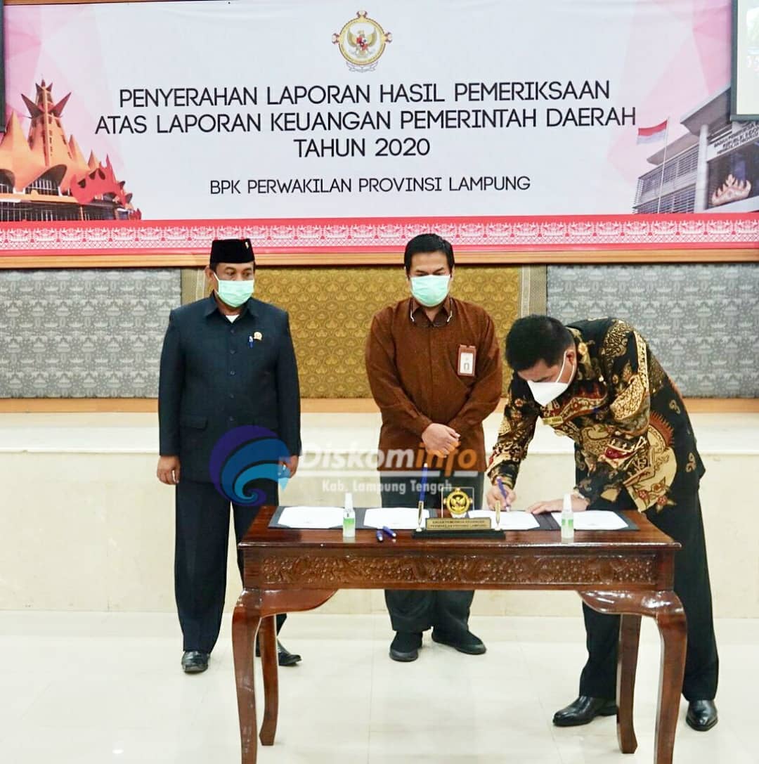 Lampung - Bupati Lampung Tengah Musa Ahmad menghadiri acara penyerahan laporan hasil pemeriksaan atas Laporan Keuangan Tahun 2020 Kantor Badan Pemeriksa Keuangan Perwakilan Provinsi Lampung Jumat 30 April 2021. Dalam acara tersebut Bupati Musa Ahmad hadir bersama Ketua DPRD Kabupaten Lampung Tengah, Kepala Inspektorat Lampung Tengah dan Kepala Badan Pengelolaan Keuangan dan Aset Daerah (BPKAD) Lampung Tengah. Dikarenakan masih dalam masa pandemi Covid-19 maka Kabupaten/Kota se-Provinsi Lampung yang hadir dibagi menjadi beberapa sesi. Dalam hasil laporan keuangan Pemda Lampung Tengah TA 2020 ini, Kabupaten Lampung Tengah Kembali mendapat predikat Wajar Tanpa Pengecualian (WTP) dari Badan Pemeriksaan Keuangan Republik Indonesia (BPK-RI) Perwakilan Lampung, atas Laporan Keuangan Pemerintah Daerah (LKPD) Tahun Anggaran 2020. Ini merupakan kali ke-3 Kabupaten Lampung Tengah mendapat predikat WTP dari BPK RI. Andri Yogama Kepala Perwakilan BPK RI Lampung mengatakan bahwa masih terdapat beberapa catatan yang perlu diperhatikan dan diharapkan diperbaiki sehingga kedepannya Pemda Lamteng bisa lebih baik lagi. BPK juga berharap Kabupaten Lampung Tengah bisa mendorong lagi agar mencapai presentase penilaian 85% karena saat ini lampung tengah mencapai 79%. Bupati Lampung Tengah Musa Ahmad dalam keterangan kepada media mengatakan bahwa kegiatan pemeriksaan yang dilakukan oleh BPK selalu disambut Pemerintah Daerah Lampung Tengah dengan tangan terbuka. Seluruh SKPD pun diinstruksikan untuk terbuka, aktif dan kooperatif dalam rangka memperlancar proses pemeriksaan. Langkah ini juga dilakukan agar pemeriksaan yang dilakukan oleh BPK dapat menjangkau seluruh program dan kegiatan pada Pemerintah Daerah Kabupaten Lampung Tengah, sehingga memperoleh rekomendasi konstruktif yang dapat ditindaklanjuti sebagai bahan pertimbangan. Dengan begitu, semua kegiatan dapat berjalan efektif dan efisien sesuai dengan ketentuan peraturan perundang-undangan yang berlaku. Musa mengatakan bahwa di masa kepemimpinan Musa Ahmad-Ardito Wijaya kedepannya akan memberikan pelayanan yang transparan dan akuntabel serta peningkatan birokrasi yang memprioritaskan kepentingan masyarakat sehingga diharapkan semua jajaran Pemerintah Daerah Lampung Tengah bekerja sama dan saling memperbaiki kinerja masing masing. Musa menambahkan juga bahwa beberapa poin catatan dari BPK akan segera ditindaklanjuti, sehingga kedepannya Kabupaten Lampung Tengah lebih baik lagi. "Saya juga atas nama Pemerintah Daerah Kabupaten Lampung Tengah mengucapkan terima kasih kepada seluruh jajaran dan pihak terkait, atas diperolehannya predikat WTP ini,” ujar Musa. Untuk diketahui bahwa Kabupaten Lampung Tengah telah mendapat predikat WTP tiga kali berturut-turut dari Badan Pemeriksaan Keuangan Republik Indonesia (BPK-RI). (Diskominfo Kabupaten Lampung Tengah)