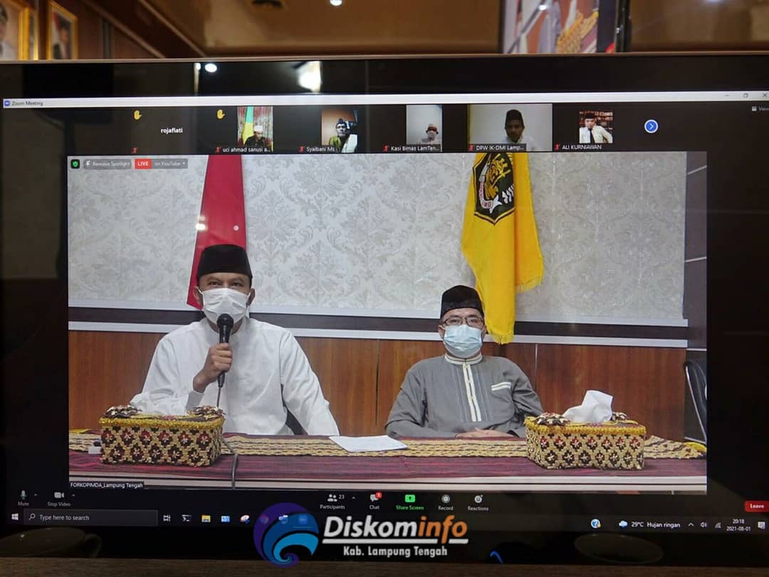 Gunung Sugih - Kapolres Lampung Tengah AKBP Wawan Setiawan, S.IK. mengikuti Dzikir dan Do'a Tolak Bala Secara Video Conference Minggu 1 Agustus 2021. Acara yang digagas oleh Ikatan Khotib Dewan Masjid Indonesia Lampung Tengah dihadiri pula Pengurus IK - DMI Lampung Tengah dan IK - DMI provinsi Lampung serta Sekertaris Dinas Kominfo Yudairi Hasan yang mewakili Bupati Lampung Tengah Musa Ahmad yang di saat bersamaan melakukan do'a dan dzikir kebangsaan 76 Tahun Indonesia merdeka. Dalam sambutan Bupati Lampung Tengah yang disampaikan oleh Sekertaris Diskominfo Yudairi Hasan menyambut baik acara ini, karena di tengah situasi Pandemi Covid-19 ini perlu adanya support doa dari para pemuka agama sehingga kita bisa segera melalui pandemi ini. Sementara itu Kapolres Lampung Tengah AKBP Wawan Setiawan, S.IK dalam sambutannya mengucapkan terima kasih atas kegiatan dzikir dan do'a tolak bala’ ini Kapolres juga berharap masyarakat Lampung Tengah tidak hentinya - hentinya berdoa di tengah pandemi ini, dan juga mengihmbau untuk tetap patuh terhadap protokol kesehatan demi menjaga diri sendiri dan keluarga agar terhindar dari virus Covid-19 ini. Setelah pembacaan doa dan dzikir di tutup dengan tausiyah agama oleh Gus Ahmad Dimyathi Selaku Ketua DPW IK - DMI Provinsi Lampung. (Diskominfo Kabupaten Lampung Tengah)