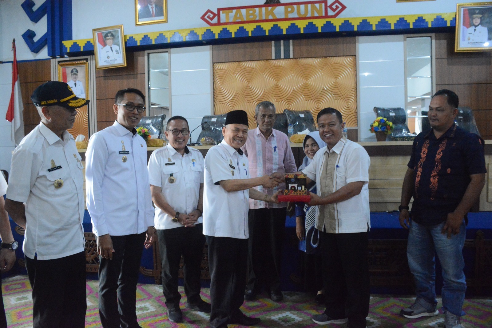 Sekretaris Daerah Kabupaten Lampung Tengah , Drs.Kusuma Riyadi.M.M. Mewakili Bupati Lampung Tengah, Musa Ahmad.S.Sos.M.M. sambut kunjungan kerja studi komperatif dan pembelajaran LPM kota Sawahlunto Sumatera barat. Rabu,24/7/2024 di Aula Siger Emas kantor Bupati lLampung Tengah. Di awal sambutanya , Drs.Kusuma Riyadi.M.M. mengucapkan selamat datang kepada bapak/ibu para pejabat tinggi pemerintah kabupaten sawahlunto provinsi sumatera barat, di bumi beguwai jejamo wawai kabupaten lampung tengah. Drs.Kusuma Riyadi.M.M. sangat mengapresiasi dan menyambut baik kunjungan kerja ini, semoga dengan kedatangan bapak/ibu di lampung tengah, dapat membawa banyak kemanfaatan demi kemajuan kabupaten kita bersama. Perlu saya informasikan kepada bapak/ibu yang terhormat, bahwa kabupaten lampung tengah merupakan kabupaten terluas di provinsi lampung, yang terdiri dari dua puluh delapan (28) kecamatan, dan 311 kampung/kelurahan. dengan jumlah penduduk lebih dari 1.4 juta jiwa dan luas wilayah lebih dari empat ribu kilometer persegi. Dengan rentang wilayah kabupaten yang begitu luas, untuk itu lampung tengah memiliki program unggulan, yakni layanan jemput bola yang dikemas dalam program bunga kampung bupati ngantor di kampung, sebagai bentuk pelayanan prima kepada masyarakat, yang berada di pelosok daerah, dan saat ini telah berkembang pelayanannya hingga ke dusun-dusun Pemerintah kabupaten lampung tengah terus bersiap diri melengkapi sarana dan fasilitas yang ada yakni dengan hadirnya mall pelayanan publik yang saat ini telah menjadi tujuan utama masyarakat untuk mengurus segala kebutuhan administrasinya. dan pada prinsipnya, kami pemerintah kabupaten lampung tengah berupaya untuk semaksimal mungkin mempermudah pelayanan kepada masyarakat dan mewujudkan reformasi birokrasi di kabupaten lampung tengah. selain itu, di bidang pemberdayaan masyarakat pemerintah kabupaten lampung tengah juga selalu bersinergi dan berkolaborasi dengan lpm kabupaten lampung tengah, dalam penyusunan langkah dan kebijakan yang dibuat guna pengentasan kemiskinan dan peningkatan kesejahteraan masyarakat. Diakhir kegiatan dilakukan penyerahan Cinderamata dari Pemerintah Kota Sawahlunto yang di wakili oleh Kadis sosial dan PMD, Ardius, S.K.m. M.k.s.kepada Sekretaris daerah Lampung Tengah.dan sebaliknya cindera mata dari pemkab lampung Tengah ke pemerintah Kota Sawahlunto. Tampak hadir dalam Kunker tersebut,