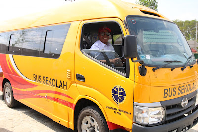 Plt. Perhubungan Lampung Tengah Kompol Syukur Kersana menyerahkan kendaraan Bus Sekolah kepada Bupati Lampung Tengah Loekman Djoyosoemarto (4/12/19). Kompol Syukur mengatakan bahwa bantuan ini untuk kendaraan Bus Sekolah, dipergunakan untuk antar Jemput siswa siswi Sekolah di wilayah Lampung Tengah. ujarnya. Bupati Lampung Tengah Loekman Djoyosoemarto saat penyerahan Kendaraan di Rumah Kayu Lingkar barat Kampung Bumimas Kec. Seputih Agung mengatakan, dengan adanya mobil Bus Sekolah ini bisa membantu anak-anak sekolah untuk antar Jemput sekolah yang pasti ini mempermudah transportasi disediakan bus gratis untuk mengangkut pelajar. “Sudah empat bus melayani pelajar tahun Lalu, Yakni rute Bandarjaya-Sulusuban satu bus, Gunung Sugih - Anak Tuha satu bus, dan Gunung Sugih - Punggur dua bus,” ujarnya. Bupati Lampung Tengah Loekman Djoyosoemarto pun langsung mencoba secara langsung kendaraan Bus sekolah tersebut, yang nantinya akan di serahkan untuk mengantar jemput pelajar. Dengan adanya Tambahan kendaraan ini pasti akan bertambah rute, nanti biar dinas perhubungan yang Menganturnya. Kita masih urus surat Izinya dulu baru kita akan Tempatkan dimana kendaraan Bus Sekolah ini. Saya berharap Bantuan ini bisa Bermanfaat bagi masyarakat Kabupaten paten Lampung Tengah .