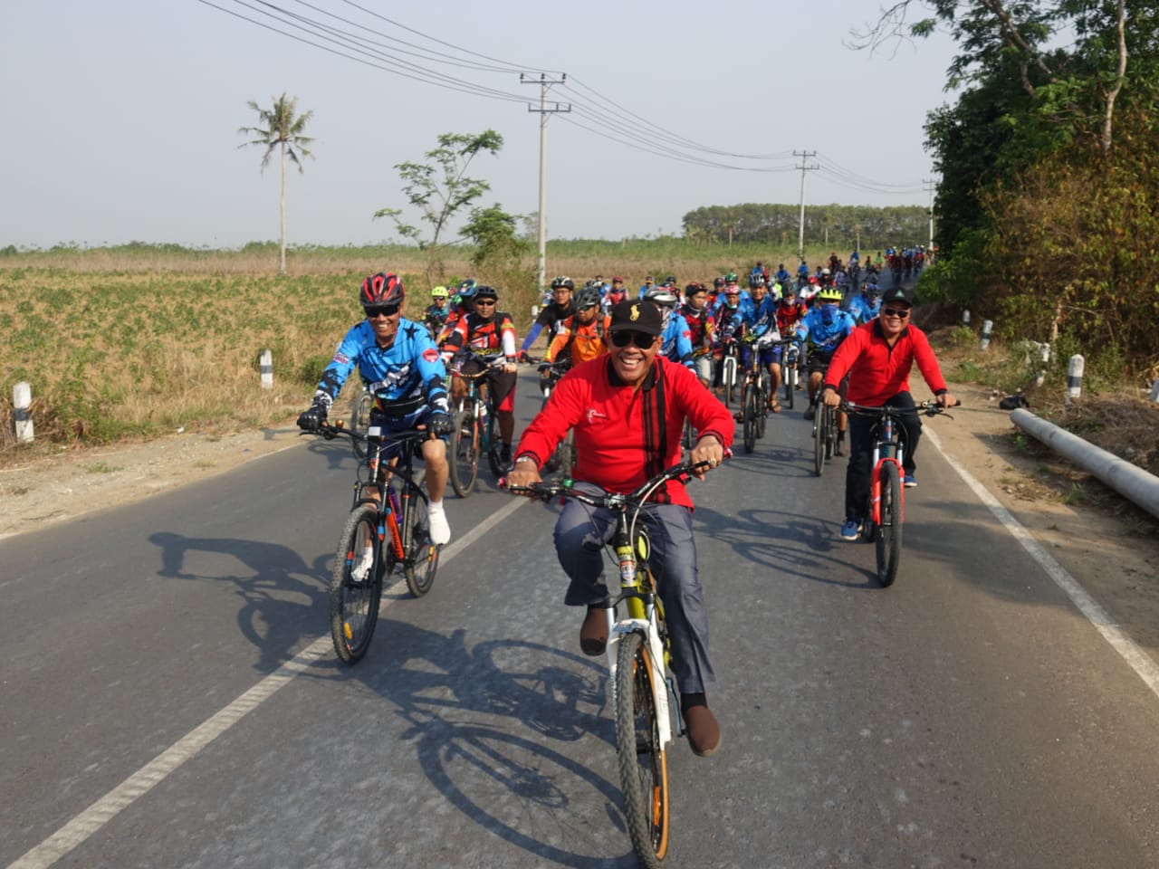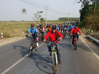 SEPUTIH AGUNG - RAPEMDA 92,8 FM, Bupati Lampung Tengah (Lamteng) Loekman Djoyosoemarto, makin masif menggelorakan semangat gotong royong di seluruh aspek kehidupan masyarakat di kabupaten setempat. Terbaru, bupati yang hobi tampil dengan kacamata hitam ini, gowes bareng goweser Lampung Tengah, Sabtu (09/11/2019). Kegiatan yang dimulai pukul 07.00 WIB itu, mengambil start dari Omah Beguwai Jejamo Wawai (BJW) Kampung Bumimas, Kecamatan Seputih Agung. Rute yang dilewati adalah, Bumimas, Adijaya Kecamatan Terbanggibesar, Kampung Bumikencana, dan kembali lagi ke Omah BJW. Bupati Loekman didampingi oleh sejumlah kepala Organisasi Perangkat Daerah (OPD), diantaranya Kepala DPMPTSP Ahmad Helmi, dan Kepala Dispora Rahardian. Kepada pewarta, Loekman menyampaikan semangatnya mengajak seluruh elemen masyarakat di wilayah setempat untuk bersepeda. “Jadi kita akan memasyarakatkan olahraga bersepeda, dan rencananya akan menjadwalkan setiap Jumat bersama OPD olahraga bersepeda. Tujuannya, agar kita dapat sehatnya, dapat semangatnya, sehingga pola pikir kita senantiasa sehat untuk membangun Lampung Tengah ke arah mandiri dan maju berkembang,” terang Bupati. Dalam kesempatan Gowes Bareng Goweser Lampung Tengah#3, Bupati juga mengingatkan masyarakat untuk terus menjaga persatuan dan kesatuan, dalam upaya mencegah radikalisme dan isu SARA. “Mari kita jaga dan rawat kabupaten tercinta ini dengan semangat gotong royong. Jangan mudah percaya dengan sebuah informasi. Apa lagi informasi hoax. Tabayyun dulu untuk memastikannya. Telaah dengan baik, dan jangan ditelan mentah-mentah. Karena persatuan dan kesatuan paling utama harus dijaga, demi Lampung Tengah maju, aman, dan nyaman,” imbau Loekman.( DISKOMINFO LAMPUNG TENGAH)