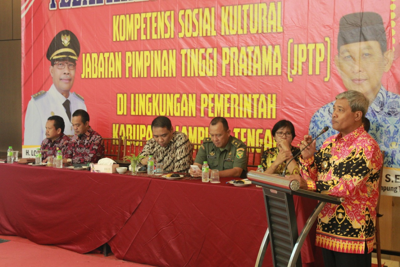 BANDAR JAYA, RAPEMDA 92,8 FM - Bupati Lampung Tengah Loekman Djoyosoemarto membuka Pelatihan Pengembangan Kompetensi Sosial Kultural Jabatan Pimpinan Tinggi Pratama Kabupaten Lampung Tengah Tahun 2019 bertempat di Hotel Revive Bandar Jaya. Acara tersebut diikuti 31 Pejabat Eselon II ( Kepala Organisasi Perangkat Daerah ) di lingkungan pemerintah Kabupaten Lampung Tengah, acara pelatihan Klasikal dan Non Klasikal berlangsung selama 3 hari atau sejumlah 27 Jam Pelajaran dengan rincian 2 Hari ( 22 Jam ) dilaksanakan di Revive Hotel dan 1 hari ( 5 Jam ) dilaksanakan di Taman Wisata Tabek Indah. Adapun acara tersebut guna melakukan pengarahan program, pembinaan wawasan kebangsaan untuk memperkuat ASN dalam rangka penyelenggaraan pemerintah umum dan kinerja OPD, tata kelola dan kebijakan anggaran, revolusi mental , pemantapan pengembangan sosial dan juga bela negara. Dalam sambutannya Bupati Lampung Tengah Loekman sangat mendukung dan mengapresiasi acara ini, dikarenakan dapat mencetak pemimpin yang berkualitas dan juga berekompeten di bidangnya. Lebih lanjut Loekman berharap para pimpinan OPD dapat mengikuti acara tersebut dengan memaknai materi – materi yang didapat dan dapat mengaplikasikannya secara tepat di lingkungan dinas nya masing – masing. Salah satu peserta JPTP, Drs. Hi. Sarjito yang juga kepala dinas komunkasi dan informatika kabupaten lampung tengah berharap kegiatan ini tidak hanya di lakukan hanya simblois, namun juga harus di dalami dan di terapkan nantinya untuk meningkatkan wawasan kebangsaan untuk memperkuat ASN dalam rangka penyelenggaraan pemerintah yang baik. ( DISKOMINFO LT )