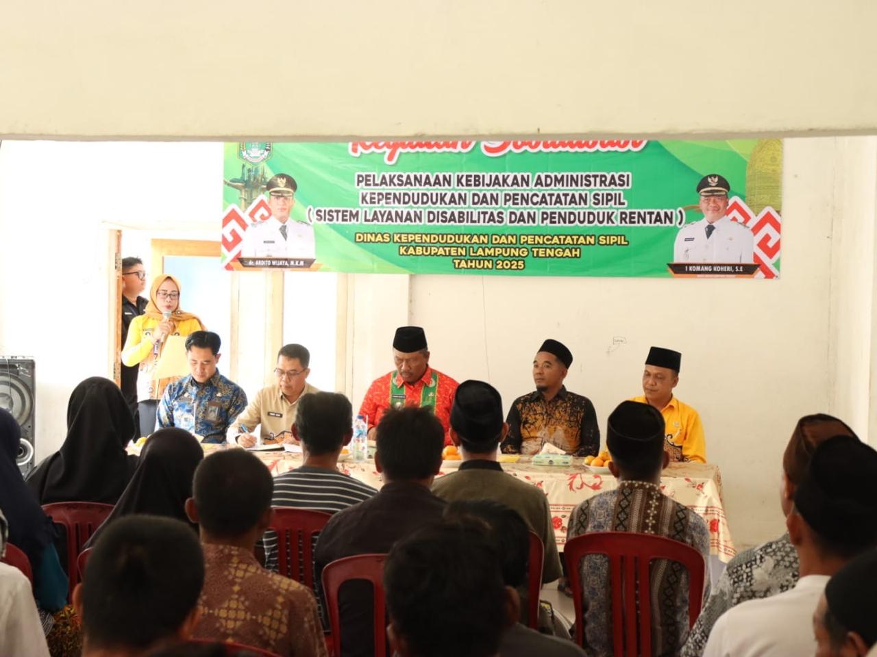 Wakil Bupati Lampung Tengah, I Komang Koheri, S.E., M.Sos., menghadiri kegiatan sosialisasi layanan administrasi bagi penyandang disabilitas dan penduduk rentan yang berlangsung di Pondok Rehabilitasi Mental Sabilun Najah, Kampung Qurnia Mataram, Kecamatan Seputih Mataram. Kamis,(11/09/2025). Kegiatan ini bertujuan memperkuat layanan publik yang inklusif dan menjangkau seluruh lapisan masyarakat, terutama kelompok yang memerlukan perhatian khusus. Acara tersebut dihadiri Kepala Dinas Kependudukan dan Pencatatan Sipil Lampung Tengah, Yudairi Hasan, Kepala Dinas Sosial Lampung Tengah, Ari Nugraha Mukti, Camat Seputih Mataram, Ridwan Pasya, serta berbagai tamu undangan dari kalangan masyarakat dan organisasi terkait. Dalam laporannya, Kepala Dinas Kependudukan dan Pencatatan Sipil Lampung Tengah, Yudairi Hasan, menjelaskan bahwa kegiatan ini bertujuan memberikan pelayanan administrasi kependudukan yang menyeluruh dan inklusif. “Kegiatan ini merupakan bagian dari upaya kami untuk memastikan pemenuhan identitas diri bagi seluruh penduduk, termasuk kelompok yang masuk kategori penduduk rentan seperti penyandang disabilitas, lansia, dan kelompok lain yang membutuhkan perhatian khusus,” ujarnya. Sementara itu, Wakil Bupati Lampung Tengah, I Komang Koheri, menyampaikan apresiasi yang tinggi kepada jajaran Dinas Kependudukan dan Pencatatan Sipil atas pelaksanaan kegiatan ini. Ia menekankan pentingnya pelayanan yang ramah dan tanpa diskriminasi, terutama bagi warga yang selama ini kesulitan mengakses layanan administrasi karena kondisi fisik, sosial, atau ekonomi. “Kami sangat mengapresiasi langkah Dinas Kependudukan dan Pencatatan Sipil yang berinisiatif memberikan pelayanan langsung ke rumah-rumah warga yang termasuk dalam kategori penduduk rentan. Hal ini sangat membantu masyarakat, khususnya penyandang disabilitas, orang dengan gangguan jiwa, lansia, tuna susila, narapidana, anak-anak terlantar, dan kelompok lain yang membutuhkan perhatian khusus,” kata I Komang Koheri. Wakil Bupati juga berharap agar masyarakat yang hadir dapat menyebarluaskan informasi ini kepada keluarga dan lingkungan sekitar yang termasuk dalam kategori penduduk rentan agar mereka dapat memanfaatkan layanan ini dengan maksimal. Ia menegaskan bahwa pelayanan administrasi tersebut diberikan tanpa dipungut biaya, sebagai wujud kepedulian pemerintah daerah terhadap kebutuhan seluruh warganya. Kegiatan sosialisasi ini diharapkan dapat memperkuat akses layanan administrasi bagi kelompok rentan dan mendorong terwujudnya masyarakat Lampung Tengah yang inklusif, sejahtera, dan berkeadilan. (Diskominfotik Lampung Tengah)