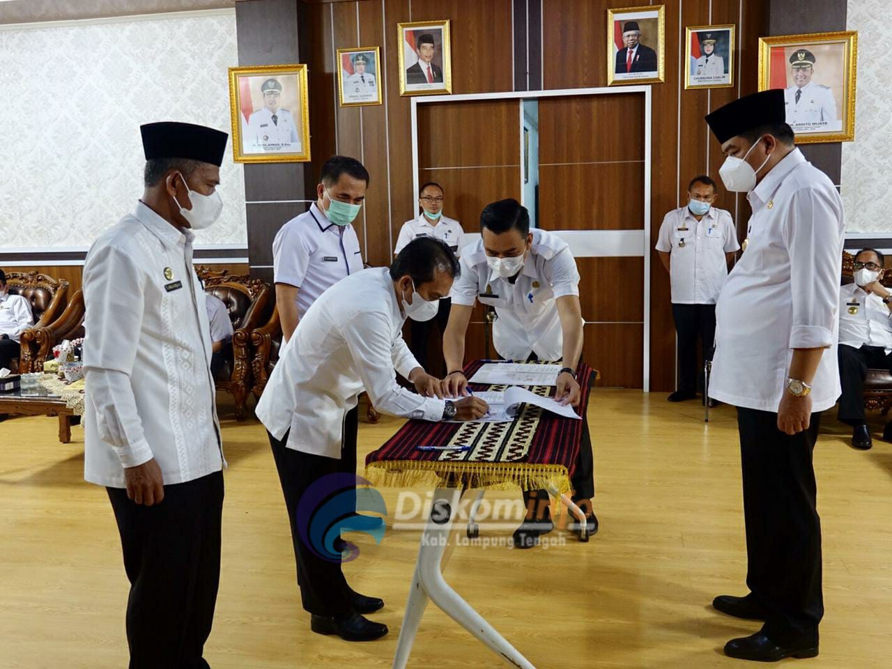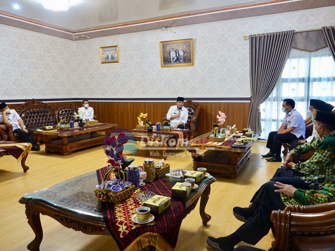 Gunung Sugih - Bupati Lampung Tengah Musa Ahmad menghadiri acara penandatanganan naskah perjanjian hibah tanah untuk pembangunan Gedung Kantor Pelayanan Haji dan Umroh terpadu antara Pemerintah Daerah Kabupaten Lampung Tengah dengan Kementerian Agama Republik Indonesia dan penandatanganan kerjasama antara Pemerintah Daerah Kabupaten Lampung Tengah dengan Kantor Badan Pertanahan Negara Gunung Sugih Lampung Tengah tentang sertifikasi tanah Pemda Lamteng di Rumah Dinas Bupati Lampung Tengah, Nuwo Balak Gunung Sugih Rabu 19 Mei 2021. Hadir dalam acara tersebut Staf Ahli Bupati, Asisten, segenap Kepala OPD Pemkab Lamteng diantaranya Kepala Kantor Kementerian Agama Republik Indonesia Kabupaten Lampung Tengah dan Kepala Kantor Badan Pertanahan Nasional Gunung Sugih. Kepala Kantor Kementerian Agama RI Kabupaten Lampung Tengah H. Farid Wajedi, S.Ag., M.Kom.I. dalam sambutannya mengatakan bahwa dengan adanya gedung ini akan memberikan warna baru khususnya kepada Lampung Tengah. "Ini merupakan keinginan kita semua untuk memberikan pelayanan yang memudahkan masyarakat," ujarnya. Bupati Lampung Tengah Musa Ahmad dalam arahannya mengatakan bahwa dirinya berharap agar gedung ini bisa segera dipergunakan dengan tujuan untuk kepentingan masyarakat. Musa juga mengatakan nantinya Lampung Tengah akan ada juga kantor imigrasi ini semua demi masyarakat Lampung Tengah dan untuk mewujudkan Lampung Tengah yang lebih maju dan berjaya. "Saya harap stakeholder terkait segera merealisasikan dan segera gedung ini bisa kita gunakan untuk masyarakat," kata Musa. (Diskominfo Kabupaten Lampung Tengah)