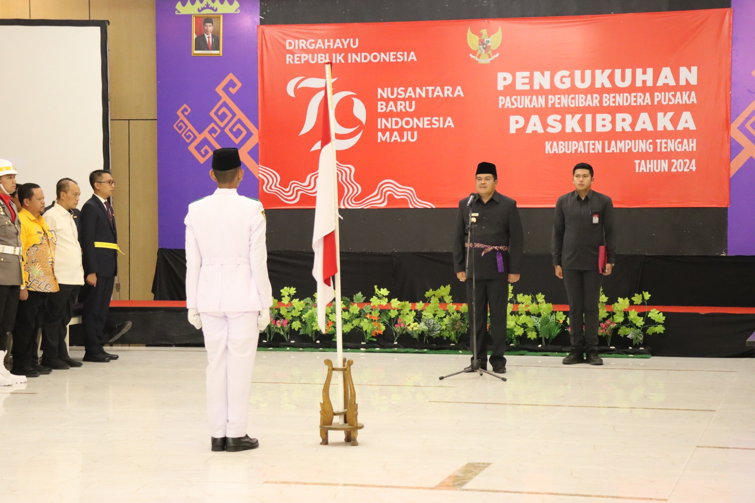 Bupati Lampung Tengah Musa Ahmad resmi mengukuhkan 40 Anggota Pasukan Pengibar Duplikat Bendera Pusaka (Paskibraka) Kabupaten Lampung Tengah tahun 2024 bertempat di Aula Hotel BBC Bandar Jaya Kamis 15 Agustus 2024. Dalam kesempatan tersebut hadir Forkopimda,Pj, Sekda, Asisten, Staf Ahli, Kepala Perangkat Daerah, Ketua PPI Lampung Tengah serta orang tua Paskibraka Lampung Tengah. Acara di awali prosesi Pengukuhan yang mana Bupati Musa Ahmad menjadi Inspektur Upacara, serta acara dilanjutkan dengan ramah tamah bersama Paskibraka dan Orang tua. Bupati Musa Ahmad dalam sambutannya mengatakan Paskibraka merupakan siswa/i terpilih melalui seleksi yang diadakan oleh Badan Kesbangpol bersama PPI serta TNI Polri, tentunya menjadi kebanggan tersendiri menjadi seorang Paskibraka. Musa berpesan para Paskibraka untuk diberikan asupan makanan yang bergizi, istirahat yang cukup, mengikuti arahan pelatih sehingga pada pelaksanaan pengibaran dan penurunan bendera pada 17 Agustus nanti bisa berjalan dengan baik. Ditambahkan Musa Ahmad dirinya juga merasa bangga, dimana tahun ini Lampung Tengah kembali mengirimkan 1 wakil Paskibraka di tingkat Pusat yang mengibarkan Bendera Merah Putih di Ibu Kota Nusantara ( IKN) serta 3 Orang di tingkat Provinsi Lampung dan malam ini di kukuhkan sebanyak 40 Anggota Paskibraka dengan rincian 20 orang Putra dan 20 Orang Putri yang berasal dari beberapa sekolah di Kabupaten Lampung Tengah. Sebagai para penerus genera muda dimasa depan, Musa Ahmad berpesan untuk mempersiapkan sejak sedini mungkin dan Paskibraka menjadi salah satu wadah membentuk karakter disiplin sehingga para Paskibraka memiliki bekal untuk menghadapi tantangan di masa depan. (Diskominfotik Lampung Tengah)