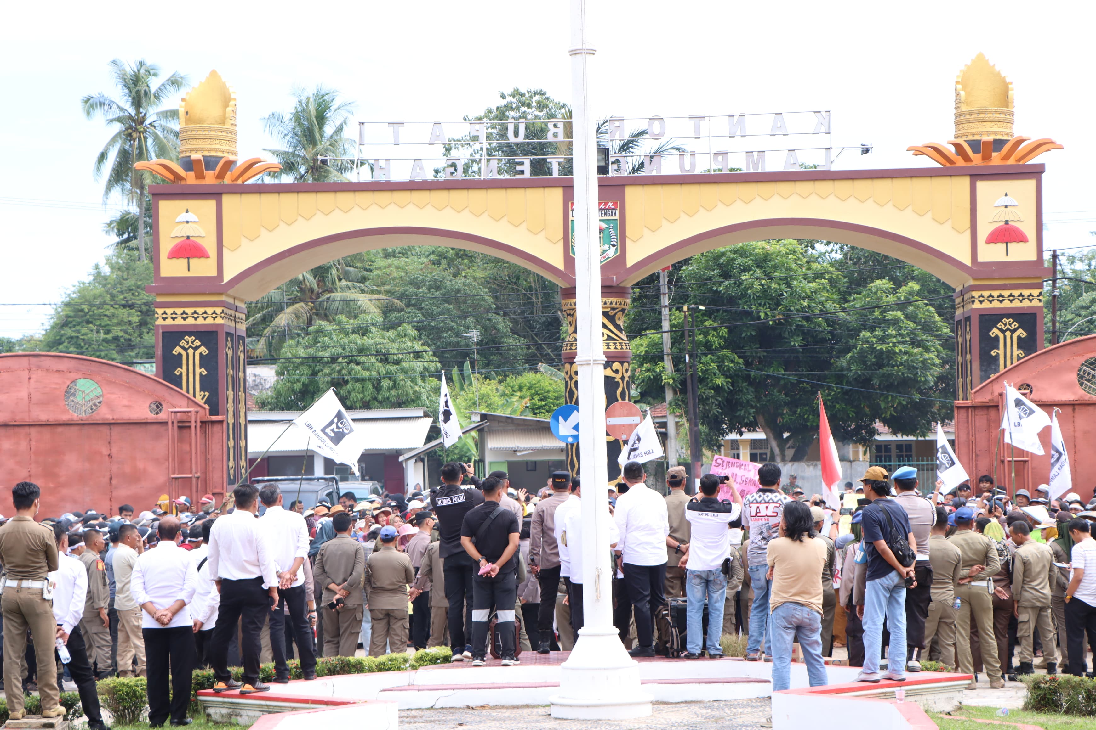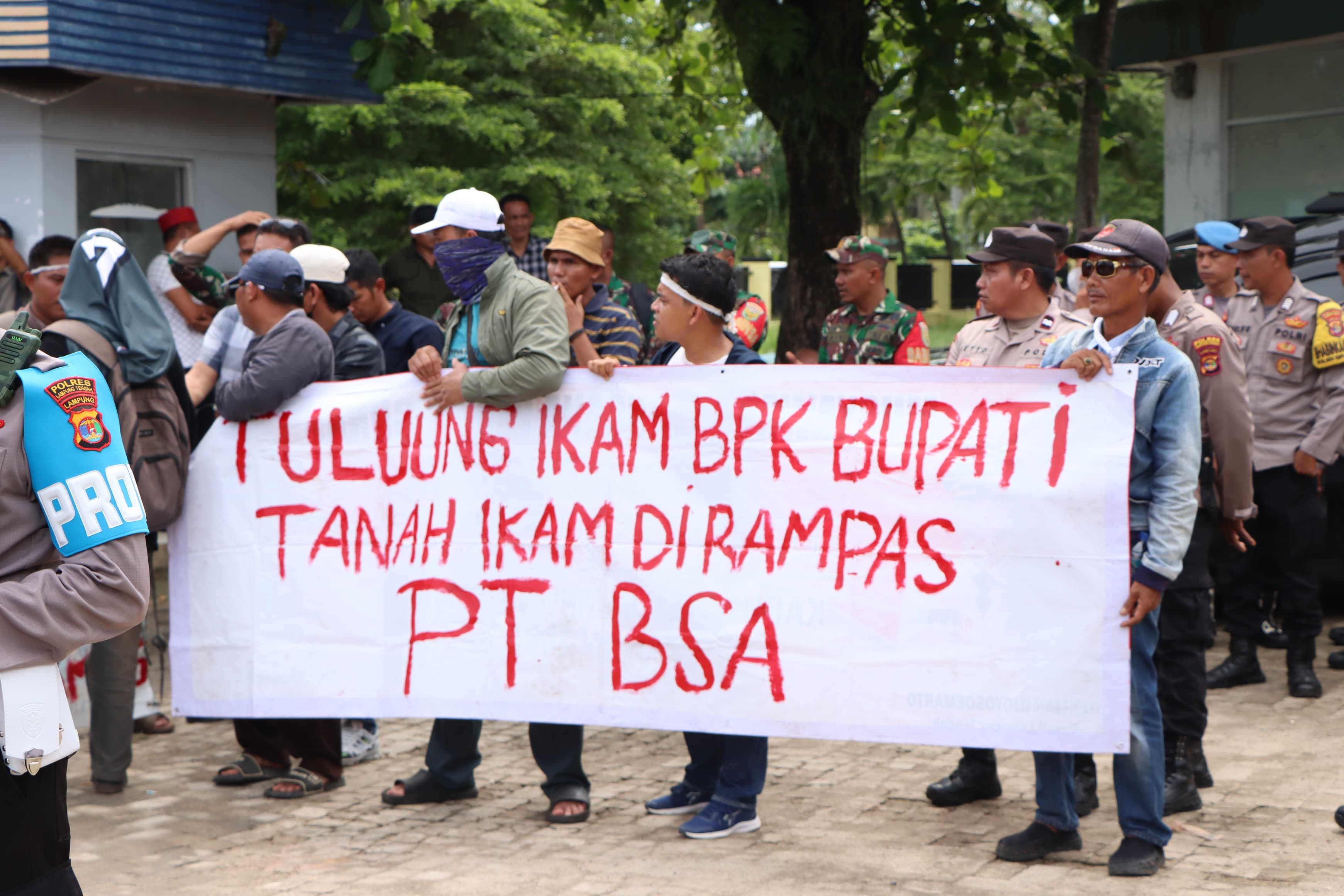 Perwakilan Masyarakat tiga kampung di Kecamatan Anak Tuha berjumlah 500 orang melakukan aksi damai di Halaman Kantor Bupati Lampung Tengah pada hari Rabu 23 April 2025, perwakilan masyarakat menuntut atas kepemilikan lahan yang bersengketa dengan PT Budi Sentosa Abadi (BSA) yang terjadi beberapa waktu lalu. Perwakilan masyarakat didampingi oleh Lembaga Bantuan Hukum (LBH) Bandar Lampung dan diterima langsung oleh Staf Ahli Bidang Pemerintahan, Hukum dan Politik Zulfikar Irwan mewakili Bupati Ardito Wijaya serta Dinas terkait. Zulfikar Irwan menyambut baik aksi damai yang dilakukan oleh perwakilan masyarakat dari tiga kampung yang ada di Kecamatan Anak Tuha, yakni Negara Aji Tua, Bumi Aji dan Negara Aji Baru yang berjalan dengan kondusif dan damai, Pemkab Lampung Tengah sampai dengan hari ini telah berupaya semaksimal mungkin dalam mencari upaya terbaik bagi kedua belah pihak. Maka dari itu Pemerintah Kabupaten Lampung Tengah akan berkomunikasi dengan pihak perusahaan guna mencari solusi dari permasalahan ini sehingga tidak berkelanjutan. Pada kesempatan itu pula Zulfikar juga menerima tuntutanan tertulis yang diberikan langsung oleh perwakilan masyarakat, dan dirinya bersama instansi terkait akan segera mempelajari sesuai dengan aturan dan UU yang berlaku. Sementara itu perwakilan tokoh masyarakat dari tiga kampung di Kacamatan Anak Tuha Glr. Kiay Pengiran mengatakan, "aksi damai hari ini merupakan bentuk kekecewaan atas permasalahan sengketa lahan antara masyarakat di tiga kampung di Kecamatan Anak Tuha dengan PT BSA," untuk itu perwakilan masyarakat meminta kepada Pemkab Lampung Tengah untuk bisa menengahi dan membantu dalam penyelesaian sengketa lahan ini. Masyarakat pula pada hari ini dibantu oleh LBH Bandar Lampung menyuarakan tuntutannya dalam aksi damai guna masalah ini bisa menemukan jalan keluar dan bisa beraktfitas kembali menjadi petani. Dirinya mengatakan bahwa selain menyuarakan aspirasi dari beberapa masyarakat secara langsung, terdapat pula tuntutan secara tertulis yang telah disusun masyarakat bersama LBH Bandar Lampung guna bisa dipelajari oleh Pemkab Lampung Tengah. Setelah menyuarakan tuntutannya masyarakat membubarkan diri dengan tertib dan damai. (Diskominfotik Lampung Tengah)
