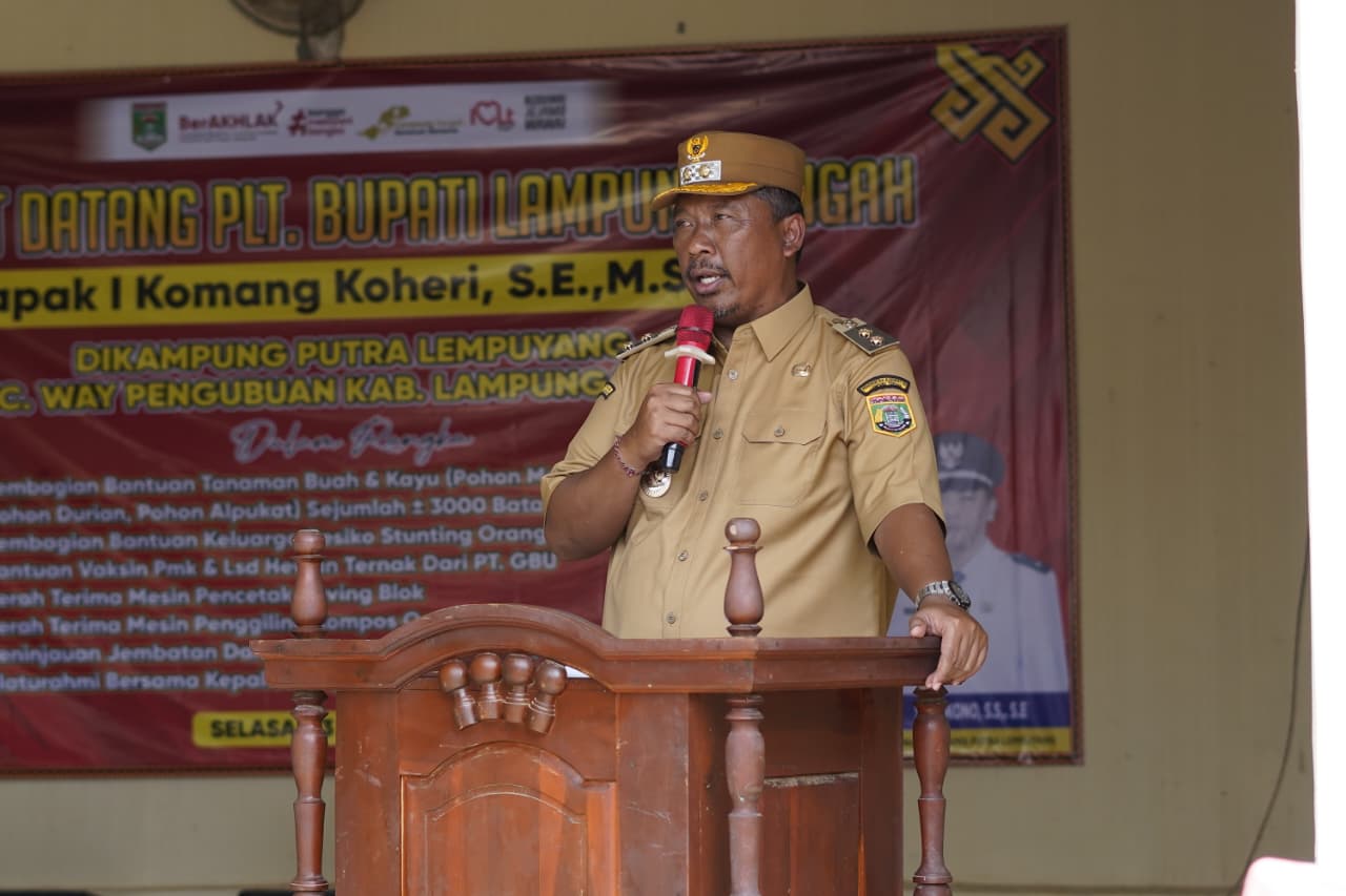 Pelaksana Tugas (Plt) Bupati Lampung Tengah, I. Komang Koheri, menghadiri kegiatan penghijauan dan penanaman pohon alpukat bersama masyarakat Kampung Putra Lempuyang, Kecamatan Way Pengubuan, Kabupaten Lampung Tengah, pada Selasa (13/01/2026). Kegiatan tersebut dihadiri oleh Kepala BPBD Kabupaten Lampung Tengah, Camat Way Pengubuan, para kepala perangkat daerah di lingkungan Pemerintah Kabupaten Lampung Tengah, para kepala kampung, serta masyarakat Kampung Putra Lempuyang. Turut hadir pula tokoh adat, tokoh agama, tokoh masyarakat, tokoh pemuda, dan tamu undangan terkait. Dalam rangkaian kegiatan, Plt. Bupati Lampung Tengah bersama masyarakat melakukan penanaman pohon alpukat sebagai bentuk komitmen bersama dalam menjaga kelestarian lingkungan serta mendukung upaya pelestarian alam di wilayah Kabupaten Lampung Tengah. Kegiatan penghijauan ini diharapkan dapat memberikan manfaat jangka panjang, baik dari sisi lingkungan maupun ekonomi masyarakat. Selain penanaman pohon, acara juga dirangkai dengan penyerahan bantuan dari Pemerintah Kabupaten Lampung Tengah kepada masyarakat, berupa benih tanaman obat-obatan, alat pengpres pakan, serta bantuan ternak dan perikanan seperti bebek dan ikan lele. Bantuan tersebut merupakan bentuk dukungan pemerintah daerah dalam memperkuat ketahanan pangan serta meningkatkan perekonomian masyarakat kampung. Dalam sambutannya, Plt. Bupati Lampung Tengah I. Komang Koheri menyampaikan bahwa kegiatan penghijauan dan penanaman pohon merupakan bagian dari upaya pemerintah daerah dalam menjaga keseimbangan lingkungan hidup sekaligus sebagai langkah mitigasi untuk mencegah terjadinya bencana alam. “Melalui kegiatan penghijauan dan penanaman pohon ini, kita ingin menumbuhkan kesadaran bersama bahwa menjaga lingkungan adalah tanggung jawab kita semua. Lingkungan yang lestari akan memberikan manfaat jangka panjang bagi kehidupan dan kesejahteraan masyarakat,” ujar Plt. Bupati. Plt. Bupati juga mengapresiasi partisipasi aktif masyarakat Kampung Putra Lempuyang yang telah mendukung penuh kegiatan tersebut. Menurutnya, sinergi dan kolaborasi antara pemerintah daerah dan masyarakat merupakan kunci utama dalam mewujudkan pembangunan yang berkelanjutan di Kabupaten Lampung Tengah. Ia berharap kegiatan serupa dapat terus dilaksanakan secara berkelanjutan di berbagai wilayah di Lampung Tengah, sehingga selain menjaga kelestarian lingkungan, juga mampu mendorong peningkatan kesejahteraan masyarakat. Kegiatan diakhiri dengan foto bersama sebagai simbol kebersamaan dan komitmen bersama dalam menjaga lingkungan serta membangun Lampung Tengah yang hijau, lestari, dan berkelanjutan (Diskominfotik Lampung Tengah)