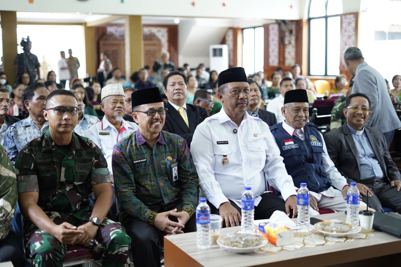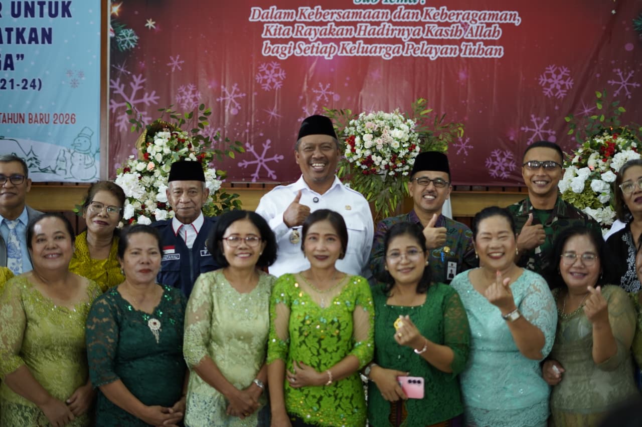 Pelaksana Tugas (Plt) Bupati Lampung Tengah, I. Komang Koheri, menghadiri Perayaan Natal Bersama Pastor, Pendeta, dan Keluarga Pelayan Tuhan se-Kabupaten Lampung Tengah yang digelar di GKSBS Bandar Jaya, Rabu (7/1/2026). Perayaan Natal tahun ini mengusung tema “Dalam Kebersamaan dan Keberagaman Kita Rayakan Hadirnya Kasih Allah bagi Setiap Keluarga Pelayan Tuhan”. Tema tersebut mencerminkan semangat persatuan, toleransi, serta keharmonisan antarumat beragama yang terus terjaga di Kabupaten Lampung Tengah. Dalam sambutannya, Plt Bupati I. Komang Koheri menyampaikan apresiasi dan ucapan terima kasih kepada seluruh pastor, pendeta, serta keluarga pelayan Tuhan yang selama ini berperan aktif dalam menjaga nilai-nilai keimanan, kedamaian, dan persaudaraan di tengah masyarakat. Ia menegaskan komitmen Pemerintah Kabupaten Lampung Tengah untuk senantiasa menjaga dan memperkuat kerukunan umat beragama sebagai fondasi utama pembangunan daerah. “Perayaan Natal ini bukan hanya momentum keagamaan, tetapi juga menjadi sarana mempererat tali silaturahmi, memperkuat persatuan, serta menumbuhkan rasa saling menghormati dalam keberagaman yang ada di Lampung Tengah,” ujar Komang Koheri. Lebih lanjut, Plt Bupati mengajak seluruh elemen masyarakat untuk menjadikan semangat Natal sebagai inspirasi dalam kehidupan sehari-hari, khususnya dalam membangun keluarga yang harmonis, saling mengasihi, serta berkontribusi positif bagi kemajuan daerah. Turut hadir dalam kegiatan tersebut Camat setempat beserta unsur Forkopimda, perwakilan Kementerian Agama Kabupaten Lampung Tengah, para tokoh agama, tokoh masyarakat, serta undangan terkait lainnya. Perayaan berlangsung khidmat, aman, dan penuh sukacita, diisi dengan doa bersama serta puji-pujian rohani. Melalui perayaan Natal bersama ini, diharapkan semakin memperkokoh toleransi dan kerukunan antarumat beragama, sekaligus mempererat sinergi antara pemerintah daerah dan para pemuka agama di Kabupaten Lampung Tengah dalam menjaga persatuan dan kedamaian.