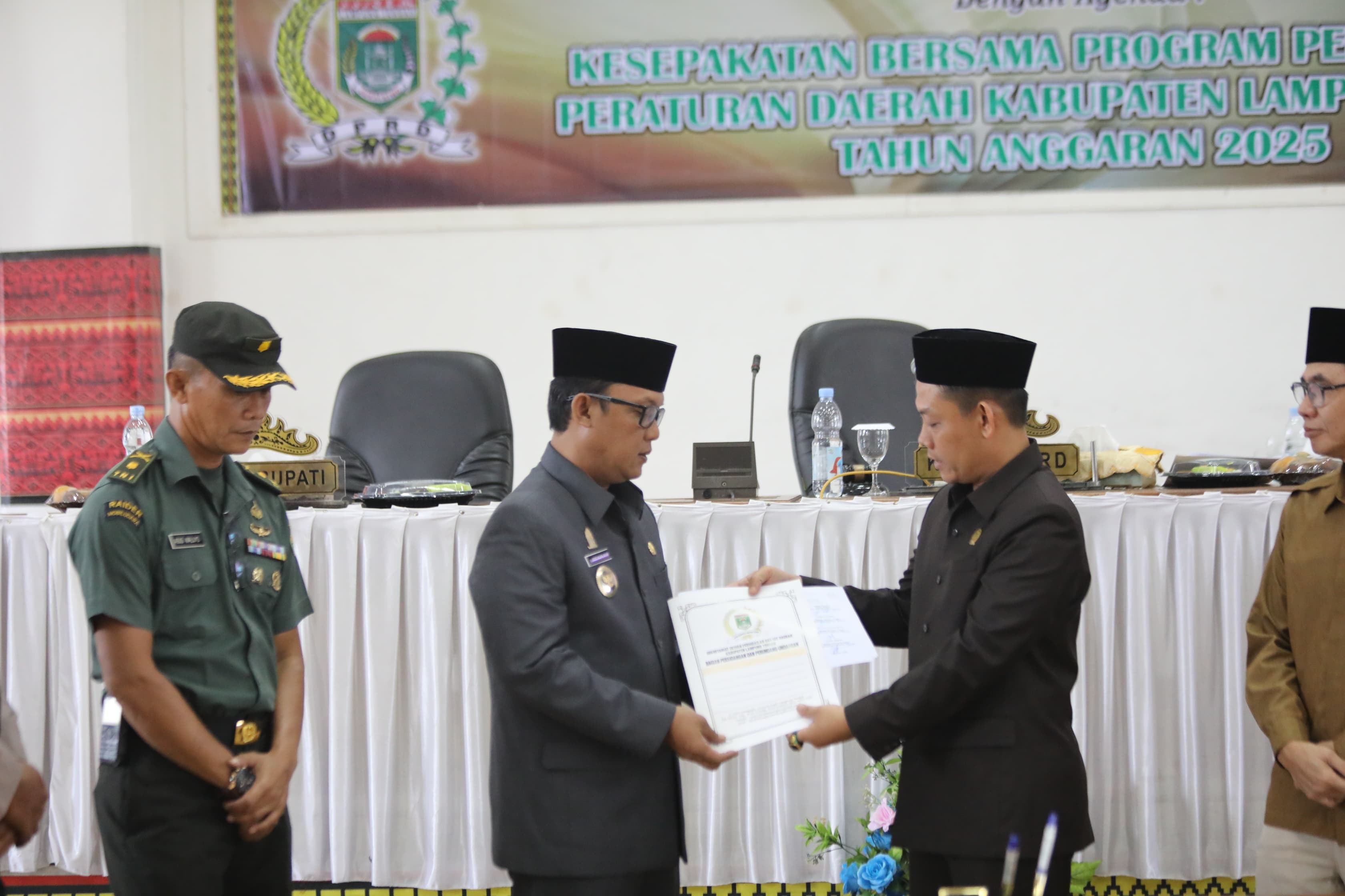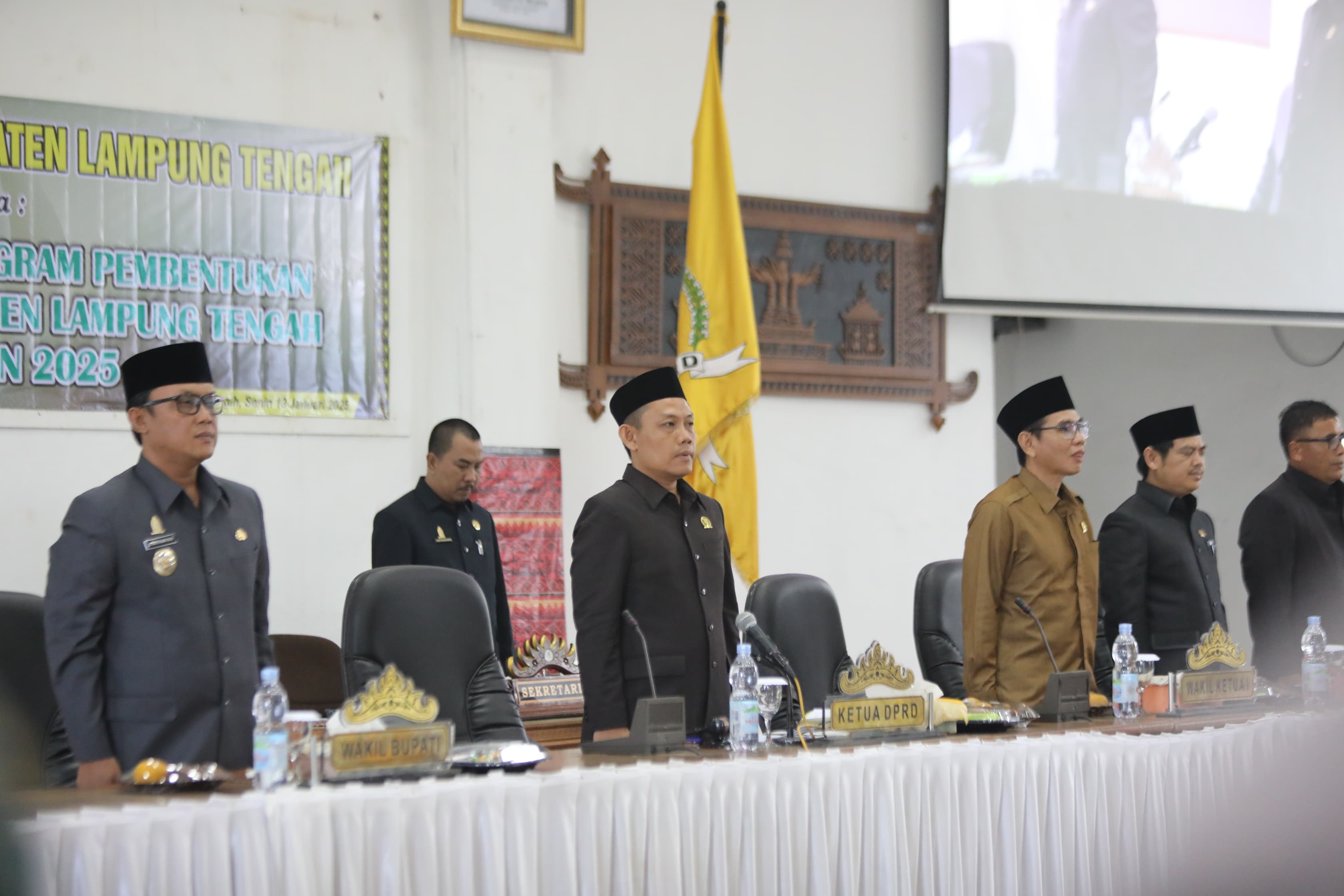Wakil Bupati Lampung Tengah (Lamteng), dr. Hi. Ardito Wijaya, M.K.M, menghadiri Rapat Paripurna Dewan Perwakilan Rakyat Daerah (DPRD) Lamteng Tahun Anggaran 2025 yang terdiri dari 13 (tiga belas) judul Raperda, dimana sebanyak 3 (tiga) Raperda merupakan Raperda inisiatif DPRD Lamteng. Bertempat di Ruang Paripurna DPRD Lamteng. Senin (13/1/2025). Tiga Raperda inisiatif DPRD Lamteng antara lain, Raperda tentang Pendapatan atas Denda Pajak Daerah dan Retribusi Daerah; Raperda tentang Perubahan Kedua Atas Peraturan Daerah Nomor 9 Tahun 2016 tentang Pembentukan dan Susunan Perangkat Daerah Kabupaten Lampung Tengah; dan Raperda tentang Badan Usaha Milik Kampung. Wakil Bupati, dr. Ardito Wijaya dalam sambutannya menyampaikan dengan telah ditetapkannya Peraturan Daerah tersebut, dapat semakin memperkuat komitmen bersama dalam menetapkan arah kebijakan untuk mewujudkan Lamteng yang lebih baik, lebih maju kedepannya. "Semoga kita antara eksekutif dan legislatif dapat terus berkolaborasi dan bersinergi dengan baik dalam membangun Kabupaten Lamteng yang kita cintai ini," singkatnya. Rapat yang dibuka secara resmi oleh Ketua DPRD Lamteng Febriyantoni, S.E, M.M turut dihadiri Para Wakil Ketua DPRD, para Anggota DPRD, Staf Ahli Bupati, Asisten dan Kepala Perangkat Daerah se - Lamteng. (Diskominfotik Lampung Tengah)