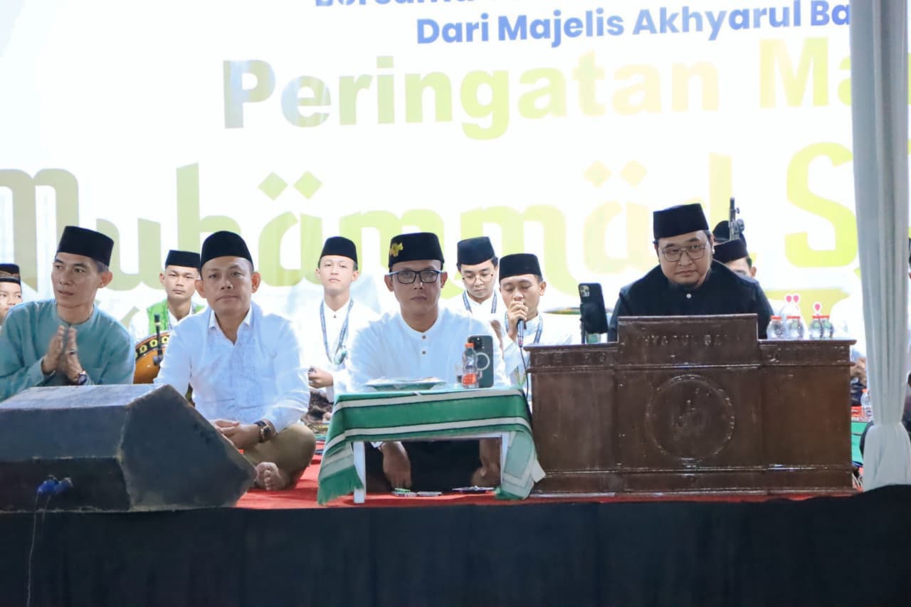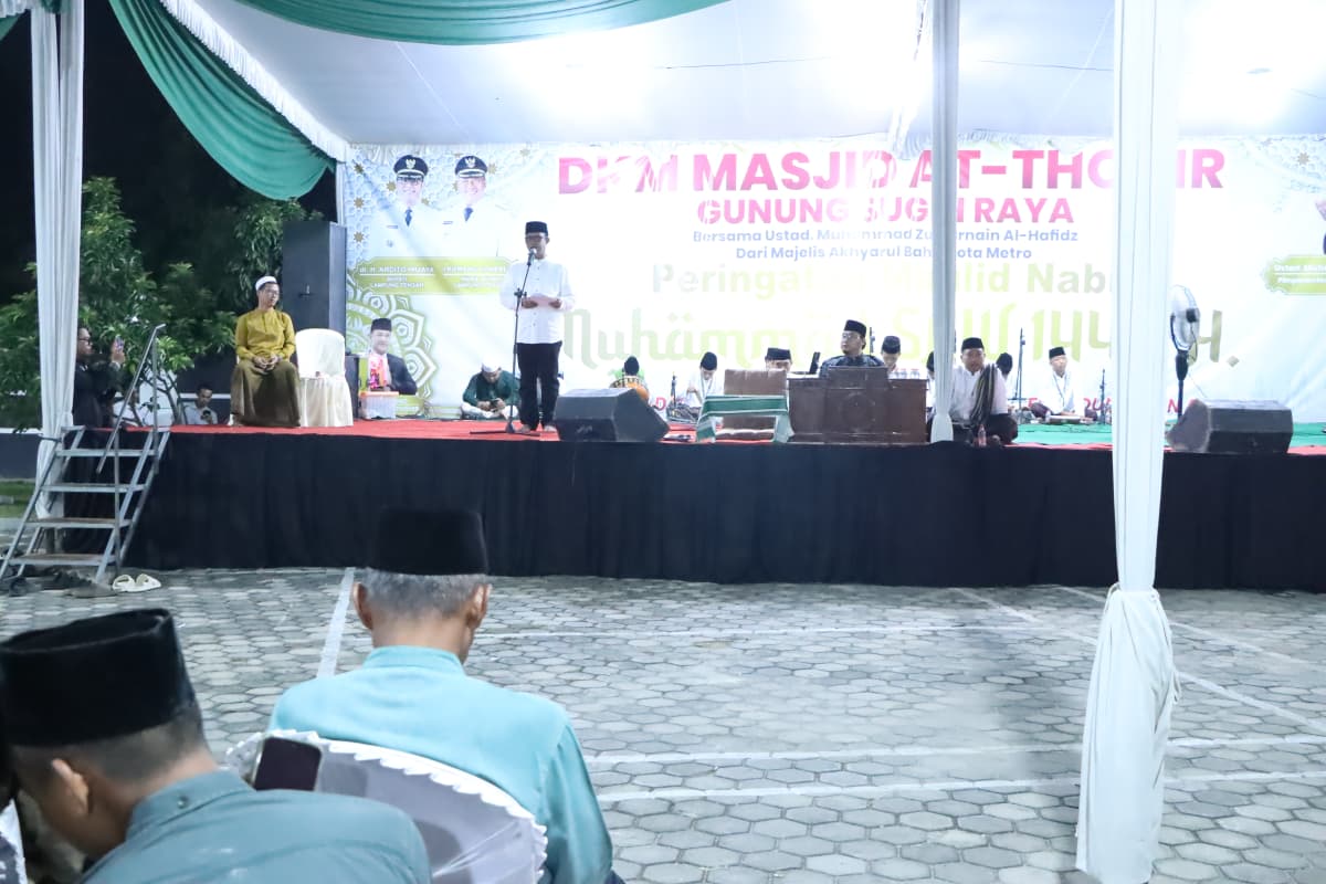 Bupati Lampung Tengah, Ardito Wijaya, menghadiri pengajian dalam rangka memperingati Maulid Nabi Muhammad SAW yang digelar di Masjid At-Thohir, Gunung Sugih, pada Minggu (14/09/2025) malam. Acara peringatan Maulid Nabi ini dihadiri Ketua DPRD Lampung Tengah, Febriyantoni, Camat Gunung Sugih beserta Jajaran Forkopimcan, ratusan jamaah, tokoh agama, tokoh masyarakat. Suasana penuh khidmat dengan lantunan shalawat dan tausiah yang menekankan keteladanan Rasulullah SAW. Ketua Panitia Pengajian, Agustam, dalam sambutannya menyampaikan rasa syukur atas terselenggaranya acara ini. Ia mengucapkan terima kasih kepada seluruh pihak yang telah mendukung, khususnya masyarakat Gunung Sugih yang berpartisipasi aktif dalam kegiatan keagamaan tersebut. “Kegiatan ini bukan sekadar seremonial, tetapi sebagai momentum untuk meningkatkan keimanan dan meneladani akhlak Rasulullah dalam kehidupan sehari-hari. Semoga pengajian ini membawa keberkahan bagi kita semua,” ujar Agustam. Sementara itu, Bupati Lampung Tengah, H. Ardito Wijaya, dalam sambutannya menegaskan pentingnya memperingati Maulid Nabi Muhammad SAW sebagai wujud kecintaan umat Islam kepada junjungan Nabi besar Muhammad SAW. “Peringatan Maulid Nabi menjadi pengingat bagi kita untuk meneladani sikap Rasulullah, terutama dalam membangun kebersamaan, menjaga ukhuwah islamiyah, serta menguatkan nilai persaudaraan dalam kehidupan bermasyarakat,” kata Bupati. Ia juga mengajak masyarakat Lampung Tengah untuk senantiasa menjaga kerukunan, memperkuat keimanan, serta menjadikan ajaran Rasulullah SAW sebagai pedoman dalam bekerja dan berkarya demi kemajuan daerah. Acara ditutup dengan tausiah agama serta doa bersama yang dipimpin oleh ustaz Muhammad Zulkarnain Al Hafidz dari Kota Metro, dengan harapan keberkahan dan keselamatan selalu menyertai masyarakat Lampung Tengah. (Diskominfotik Lampung Tengah)