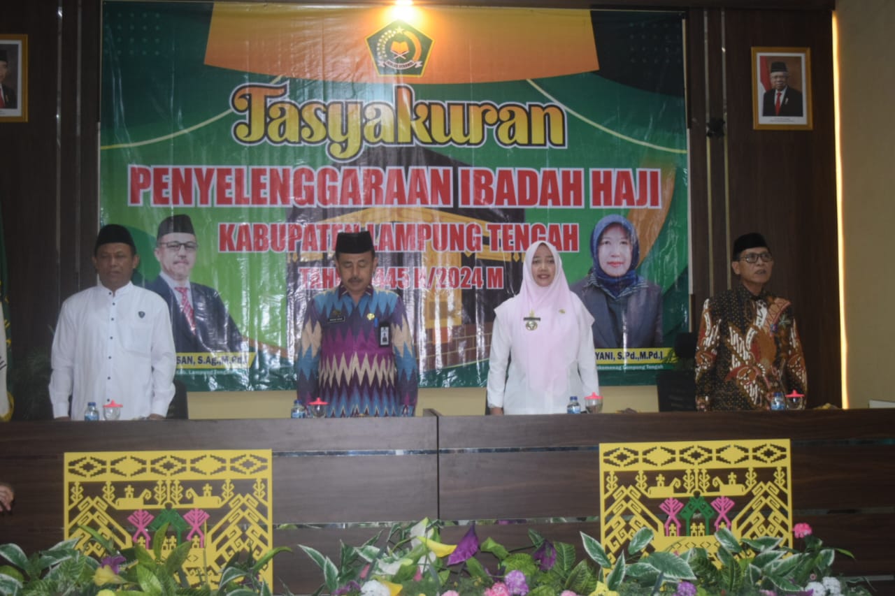 Staf Ahli Bupati Bidang Kemasyarakatan dan Sumber Daya Manusia, Dr.Candra Puasati S.Pd.M.Pd. mewakili Bupati Lampung Tengah ,Musa Ahmad S.sos.M.M. menghadiri acara tasyakuran penyelenggaraan ibadah haji di aula kantor Kemenag Kabupaten Lampung Tengah. Kamis,01/08/2024. Hadir pula dalam kegiatan tersebut, ketua NU Kabupaten Lampung Tengah, Ketua IPHI, Kasubbag TU, Kasi dan Penyelenggara Kemenag Kabupaten Lampung Tengah, Camat Gunung Sugih, Kapolsek Gunung Sugih, Danramil Gunung Sugih, Kepala KUA se-Kabupaten Lampung Tengah, KBIHU se-Kabupaten Lampung Tengah, perwakilan jamaah haji 2024, serta petugas haji 2024. Kepala Kantor Kemenag Kabupaten Lampung Maryan Hasan, S. Ag., M. Pd.I dalam sambutanya menyampaikan terima kasih kepada seluruh instansi terkait atas dukungan dan kerja sama dalam pelaksanaan pelayanan ibadah haji tahun 2024. Beliau juga menyampaikan harapannya agar tahun depan Kabupaten Lampung Tengah dapat memiliki kantor pusat pelayanan haji dan umrah sendiri, untuk meningkatkan kualitas pelayanan kepada masyarakat. Acara tasyakuran ini menjadi ajang silaturahmi dan apresiasi bagi semua pihak yang terlibat, serta refleksi bersama untuk menyongsong perbaikan pelayanan haji di masa mendatang. Sementara itu ,Staf Ahli Bupati Bidang Kemasyarakatan dan Sumber Daya Manusia,Dr.Candra Puasati.S.Pd.M.Pd mewakili Bupati Lampung Tengah, H. Musa Ahmad.S.Sos.M.M. mengucapkan terima kasih dan apresiasi kepada Panitia Penyelenggara Ibadah Haji tahun 2024 , baik tingkat Pusat, Propinsi maupun Kabupate Lampung Tengah atas kerjasama semua Pihak dalam memberikan layanan terbaik terhadap jamaah haji dimulai dari pelaksanaan Bimbingan Manasik Haji Tingkat Kecamatan, Kabupaten Lampung Tengah dan pelayanan pemberangkatan sampai dengan pelayanan pemulangan jamaah haji sehingga kegiatan ini dapat berjalan lancar, aman dan sukses. (Diskominfotik Lampung Tengah)