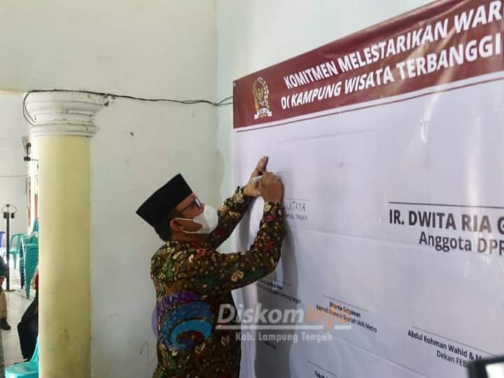 Terbanggi Besar - Potensi pariwisata di Kabupaten Lampung Tengah dapat menjadi salah satu faktor peningkatan ekonomi masyarakat. Oleh karena itu semua elemen terkait harus bersama-sama mengembangkan sektor pertanian. Hal tersebut disampaikan oleh Wakil Bupati Lampung Tengah Ardito Wijaya dalam acara pembukaan FGD Persiapan Pengembangan Kampung Wisata Terbanggi Besar bertempat di Balai Kampung Terbanggi Besar (27/05/2021). Dalam acara ini selain Wakil Bupati hadir pula Anggota DPR RI Komisi X Ir. Dwita Ria Gunadi didampingi oleh Plt. Kadis Pariwisata Dra. Ancar Asmara Dewi, MM. dan kepala OPD terkait lainnya. Dalam sambutannya, Wakil Bupati Ardito Wijaya mengatakan bahwa salah satu tujuan acara ini adalah terciptanya persamaan persepsi keterpaduan langkah pemerintah dan masyarakat dalam pengembangan kepariwisataan Kabupaten Lampung Tengah. Lampung Tengah memiliki banyak potensi namun belum dikembangkan secara sempurna salah satu nya adalah sektor pariwisata. Salah satu komitmen Pemda Lamteng adalah untuk meningkatkan kesejahteraan masyarakat salah satunya melalui sektor pariwisata di mana akan dilaksanakan pengembangan kampung wisata di setiap destinasi wisata yang ada di Kabupaten Lampung Tengah baik itu destinasi wisata alam, religi, budaya dan destinasi buatan. "Semoga peningkatan sektor pariwisata juga mampu mengurangi angka pengagguran dan menambah lapangan pekerjaan," ujar Ardito. Wabup juga berharap dengan kegiatan ini dapat mewujudkan kesadaran masyarakat dan lingkungan nya untuk mengembangkan potensi wisata di daerah masing-masing sehingga bermanfaat bagi peningkatan ekonomi masyarakat. Usai acara Wakil Bupati Ardito Wijaya didampingi Andika Wibawa Sepulau Raya sebagai tokoh masyarakat meninjau langsung Kampung Wisata Terbanggi yang memiliki peninggalan bersejarah dan aset budaya seperti rumah adat Lampung yang usianya sudah ratusan tahun, Ardito Wijaya berpesan agar peninggalan budaya ini dapat dijaga dilestarikan sehingga dapat menjadi warisan bagi anak cucu kita kelak. (Diskominfo Kabupaten Lampung Tengah)