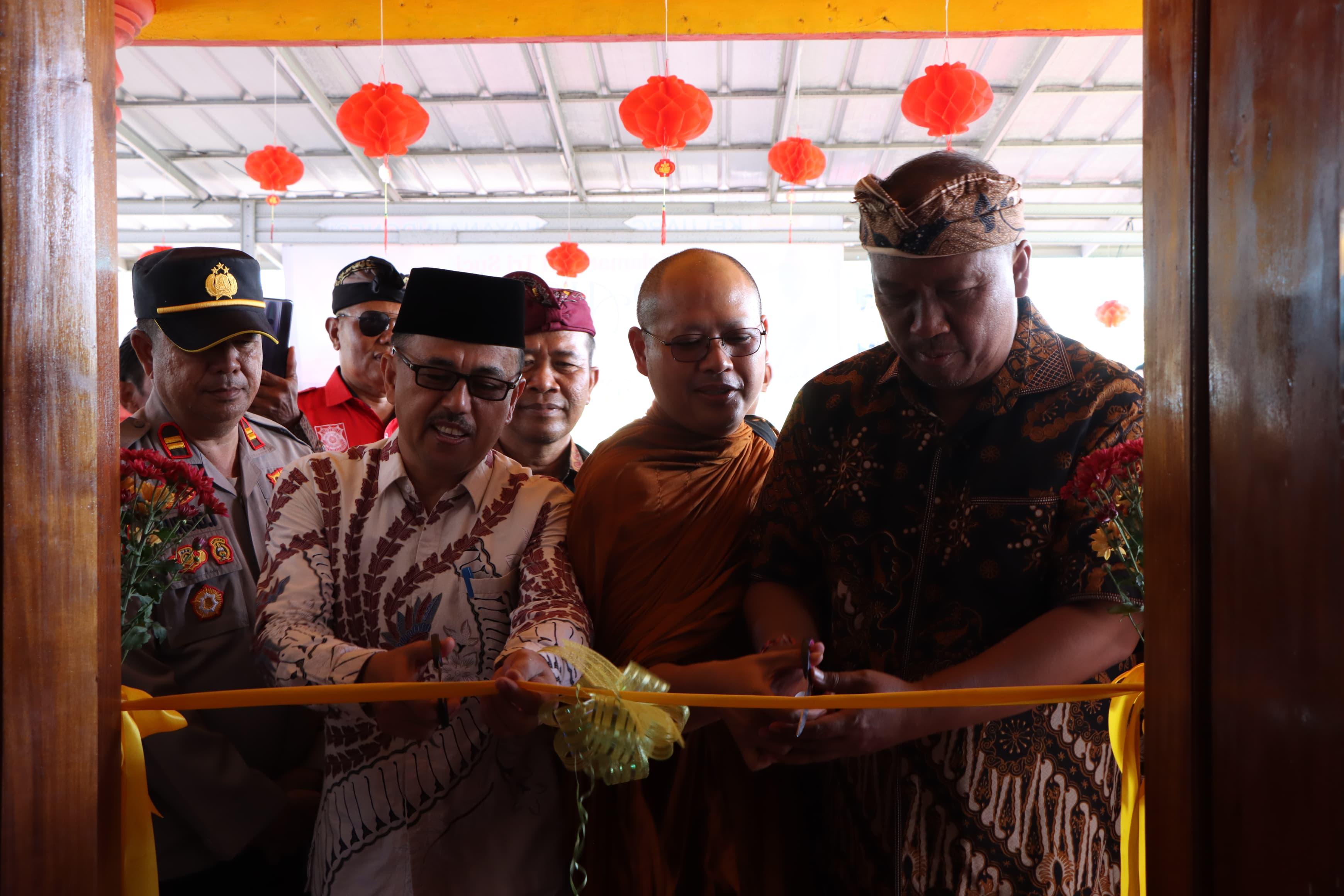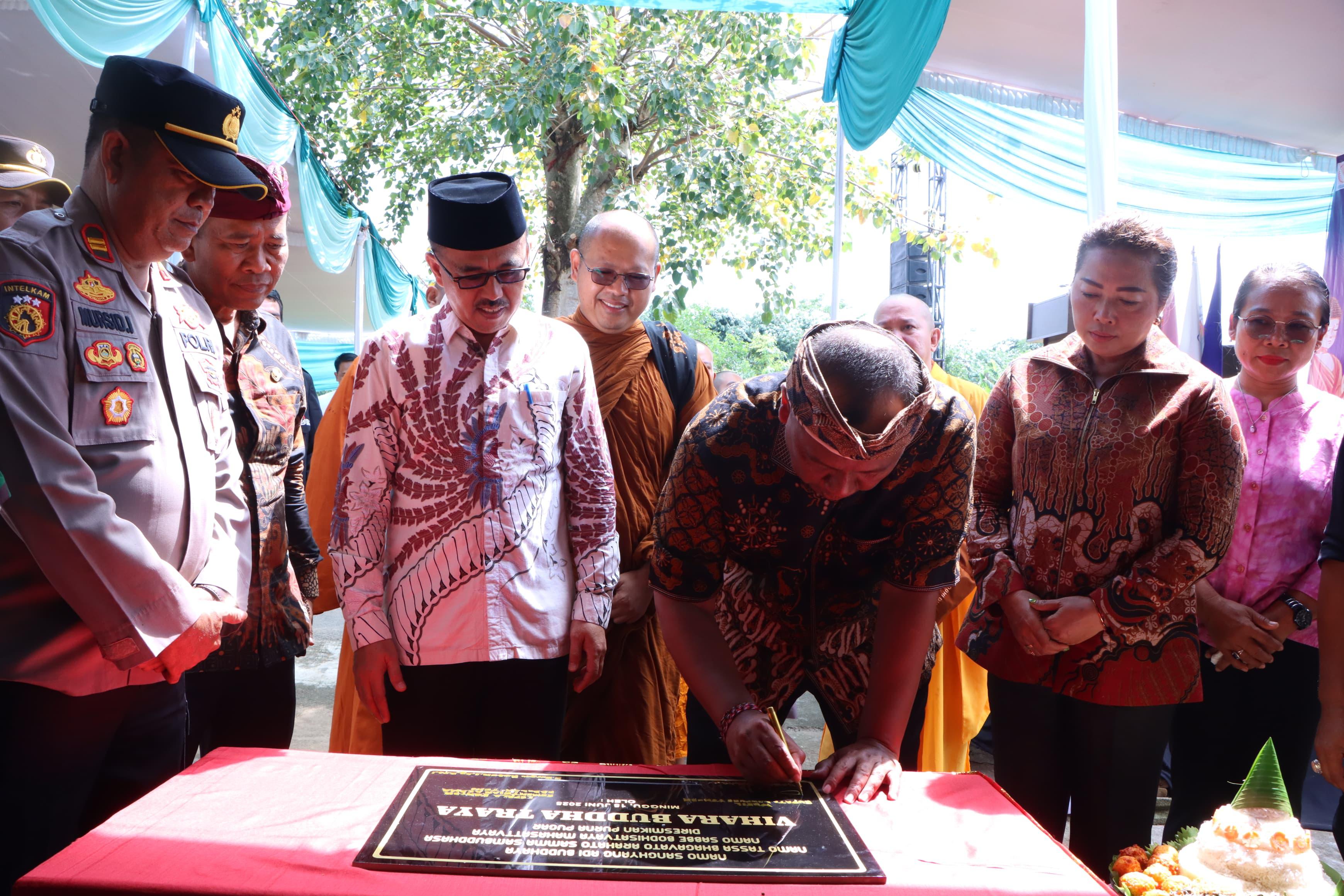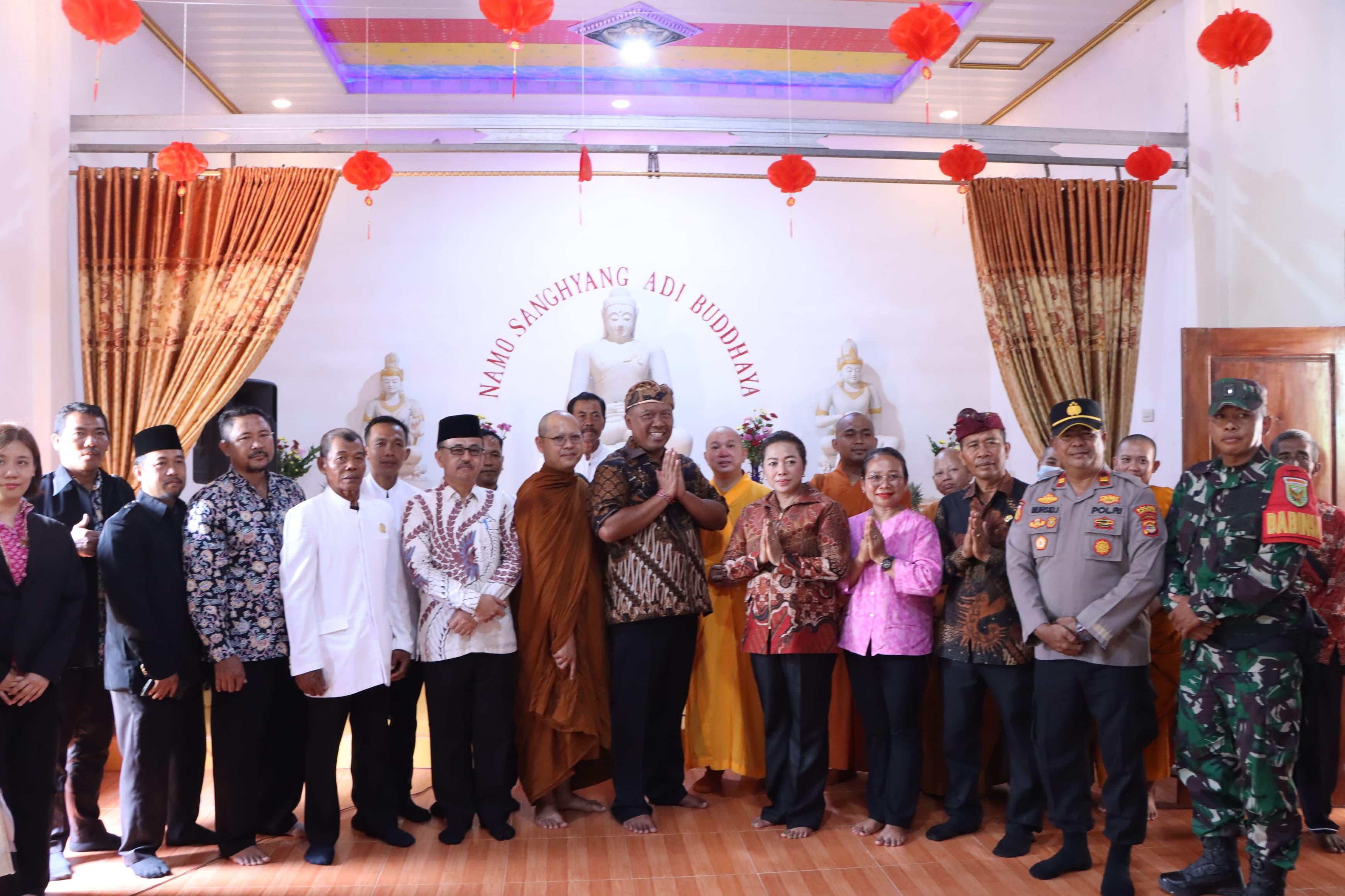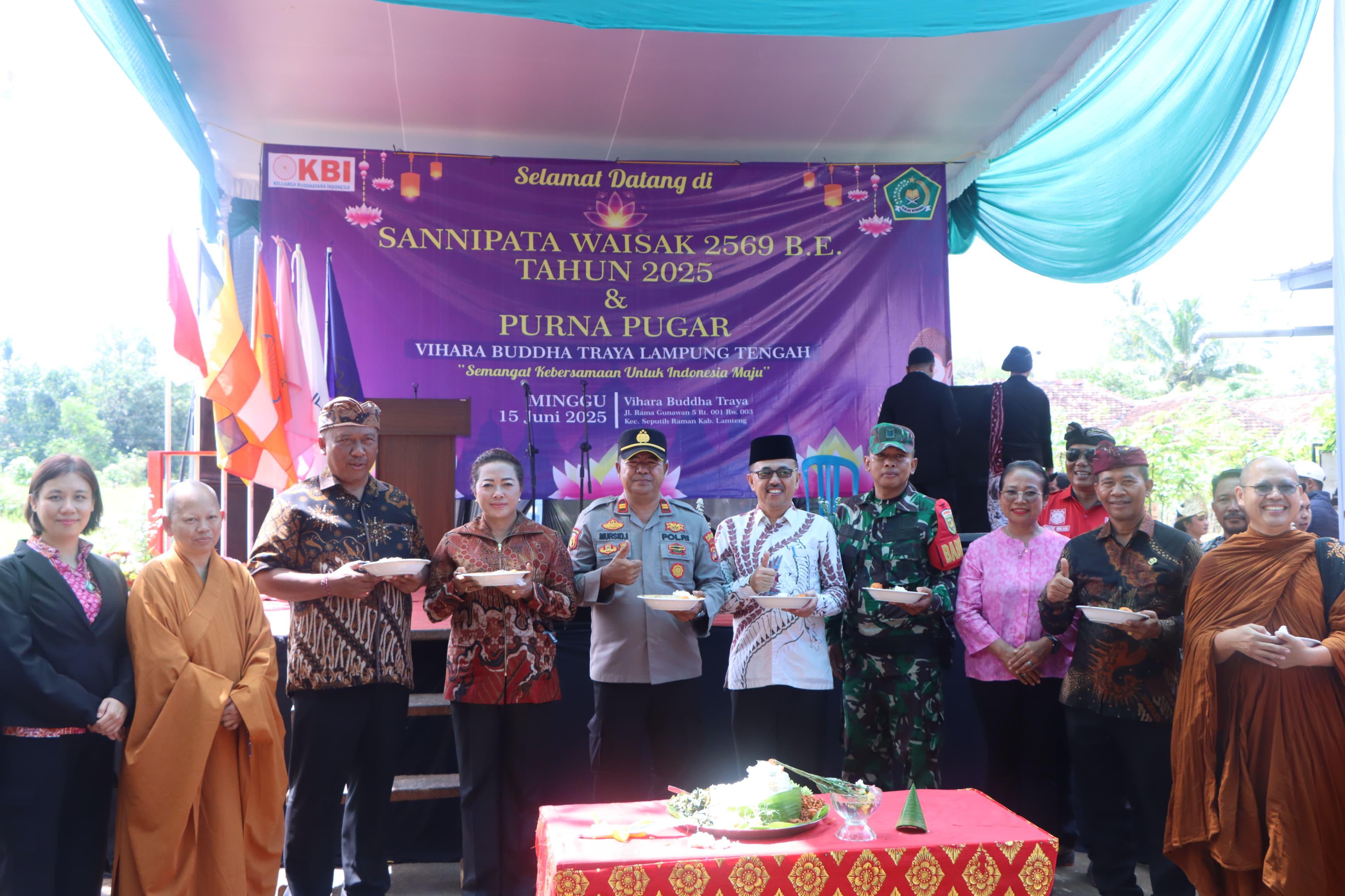 Wakil Bupati Lampung Tengah I Komang Koheri menghadiri Sannipata Waisak 2569 B.E Tahun 2025 sekaligus meresmikan Vihara Buddha Traya, Minggu (15/06/2025).acara berlangsung dihalaman Vihara Buddha Traya Kampung Rama Gunawan Kecamatan Seputih Raman ini mengusung tema “ semangat kebersamaan untuk indonesia maju”. Wabub dalam sambutanya menyampaikan bahwa pembangunan di Lampung Tengah memerlukan kolaborasi dari beberapa pihak termasuk Pemerintah dan para pemuka agama, kegiatan hari ini adalah bagian dari kewajiban dari Pemerintah. Wabub I Komang Koheri juga berharap kepada umat buddha terus membantu Pemerintah Daerah dalam membangun Kabupaten ini semakin maju dan sejaterah. Ikut mendampingi Wakil Bupati Wakil Ketua TP PKK Lampung Tengah Sekaligus Ketua Anggota DPRD Provinsi Lampung Ni Ketur Dewi Nadi, Kepala Kemenag Lampung Tengah H. Maryan Hasan, S. Ag., M. Pd.I, Majelis Buddhayana Indonesia Prov.Lampung YM. Bhikkhu Pannajoto Thera, Camat Seputih Raman, Fokpoimcam dan para umat Buddha Lampung Tengah. (Diskominfotik Lampung Tengah)