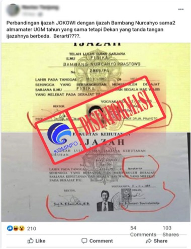 Beredar unggahan di media sosial 2 gambar ijazah dari Universitas Gadjah Mada (UGM) dengan narasi “Perbandingan ijazah JOKOWI dengan ijazah Bambang Nurcahyo sama2 almamater UGM tahun yang sama tetapi Dekan yang tanda tangan ijazahnya berbeda. Berarti????." Dalam komentar unggahan tersebut, akun menulis "Dekan itu pemegang administrasi perguruan tinggi. Hanya ada satu Dekan di satu perguruan tinggi, dan satu wakil dekan". Gambar ijazah yang diunggah adalah gambar ijazah atas nama "Bambang Nurcahyo Prastowo" dari Fakultas Matematika dan Ilmu Pengetahuan Alam UGM dan ijazah atas nama "Joko Widodo" dari Fakultas Kehutanan UGM. Klaim bahwa hanya ada satu dekan di satu perguruan tinggi terkait tanda tangan dekan yang berbeda pada 2 ijazah mahasiswa Universitas Gadjah Mada (UGM) pada tahun 1985 adalah klaim yang salah. Dekan di UGM memang berbeda tiap fakultas. Pada tahun 1985, Dekan Fakultas Kehutanan UGM adalah Prof.Dr. Soenardi Prawirohatmodjo dan Dekan Fakultas MIPA UGM adalah Prof. Dr. Ir. Prayoto, M.Sc., serta Rektor UGM saat itu adalah Prof. Dr. Teuku Jacob. Foto ijazah yang diunggah oleh sumber klaim memang benar milik Bambang Nurcahyo Prastowo dari Fakultas Matematika dan Ilmu Pengetahuan Alam UGM. Terkait ijazah atas nama “Joko Widodo” sudah ditegaskan oleh pihak UGM bahwa ijazah tersebut asli dan dikeluarkan pada 5 November 1985. Ijazah itu ditandatangani oleh Dekan UGM Prof Dr Soenardi Prawirohatmodjo M.S, M.D dan Rektor UGM Prof DR T Jacob M.S M.D.