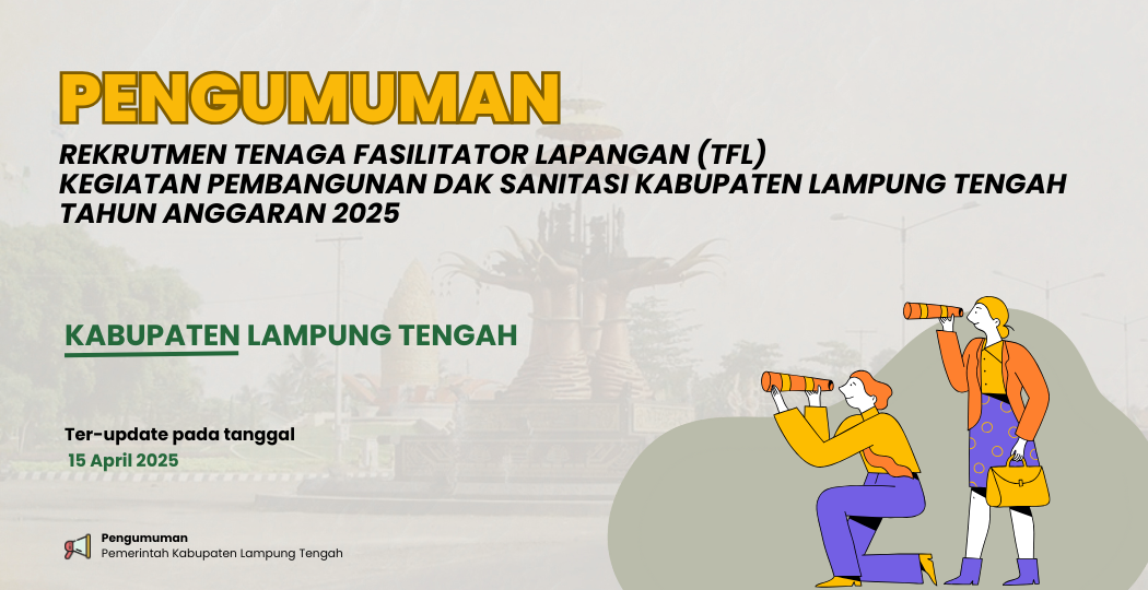 Unduh Pengumuman Selengkapnya melalui tautan di bawah ini: Rekrutmen Tenaga Fasilitator Lapangan (TFL) Kegiatan Pembangunan DAK Sanitasi Kabupaten Lampung Tengah Tahun Anggaran 2025